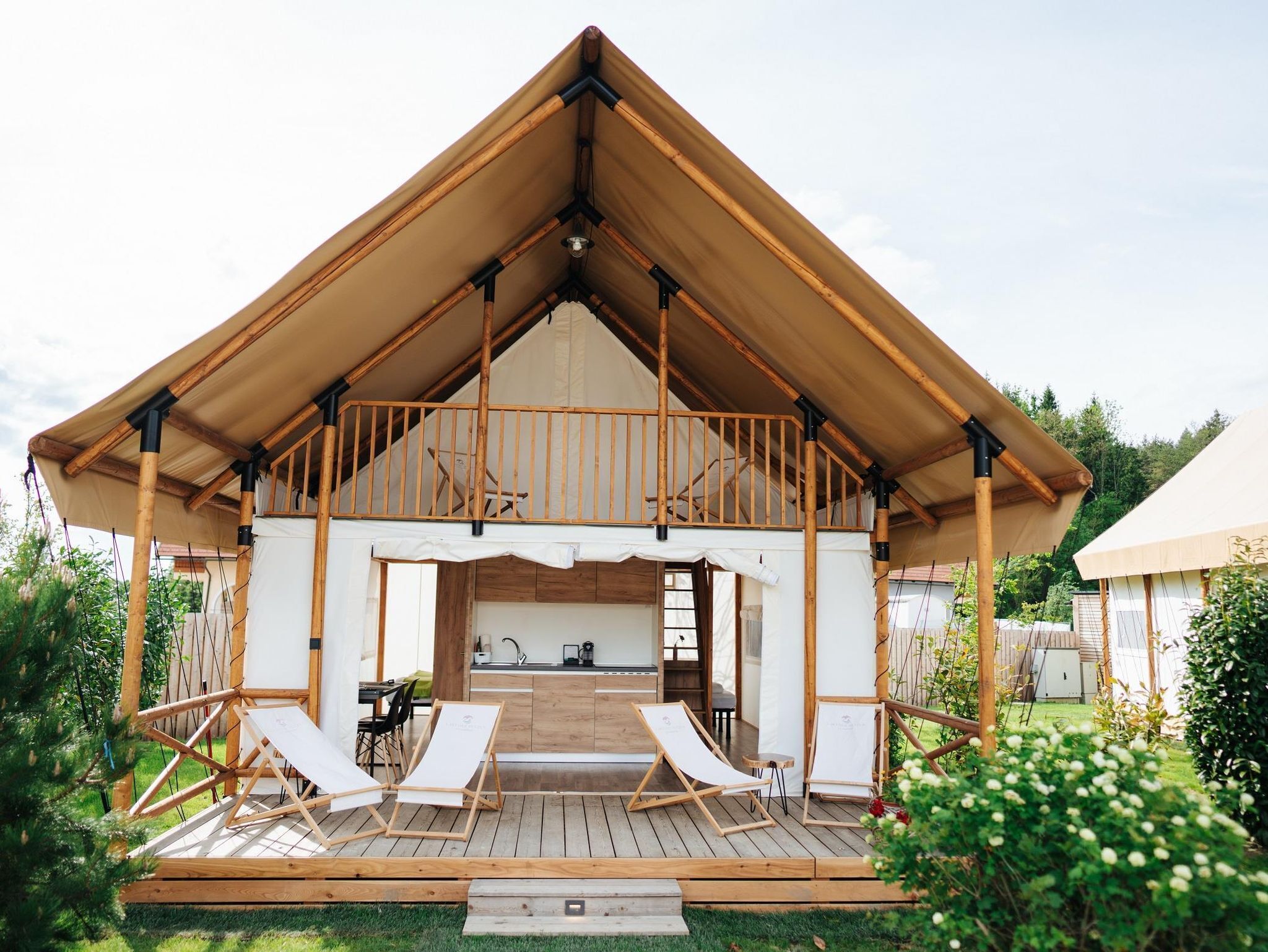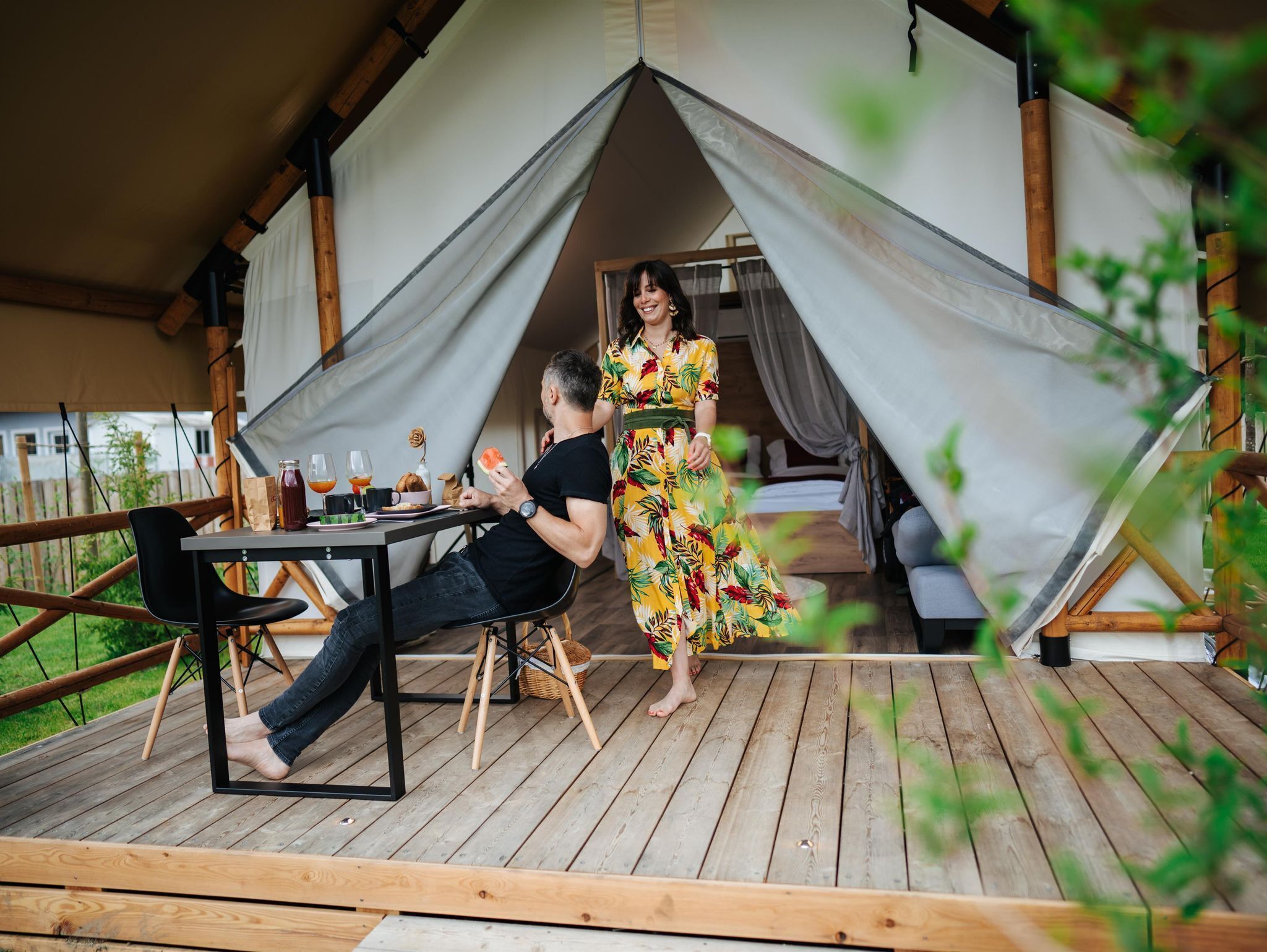 The Hiker's Cabin 2+1 guarantees a unique stay in nature. The cosy, barrel-shaped hiking hut is ideal for anyone looking for the ultimate nature experience. The sleeping barrel is on the ground floor and can accommodate up to 2 adults and one child up to 6 years old (max. height 1.50 m). It consists of a sleeping area with 1 double bed, a table with seating and a television. During your stay, you can use the park's modern sanitary facilities. These are equipped with (disabled-friendly) toilets, showers and washbasins. In addition, air conditioning is available and pets are welcome for a fee. The small terrace invites you to relax and unwind, with a beautiful view of the mountains.