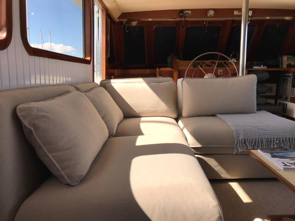 - table and seating area at the stern, to chill and relax to enjoy the sea breeze at the marina.