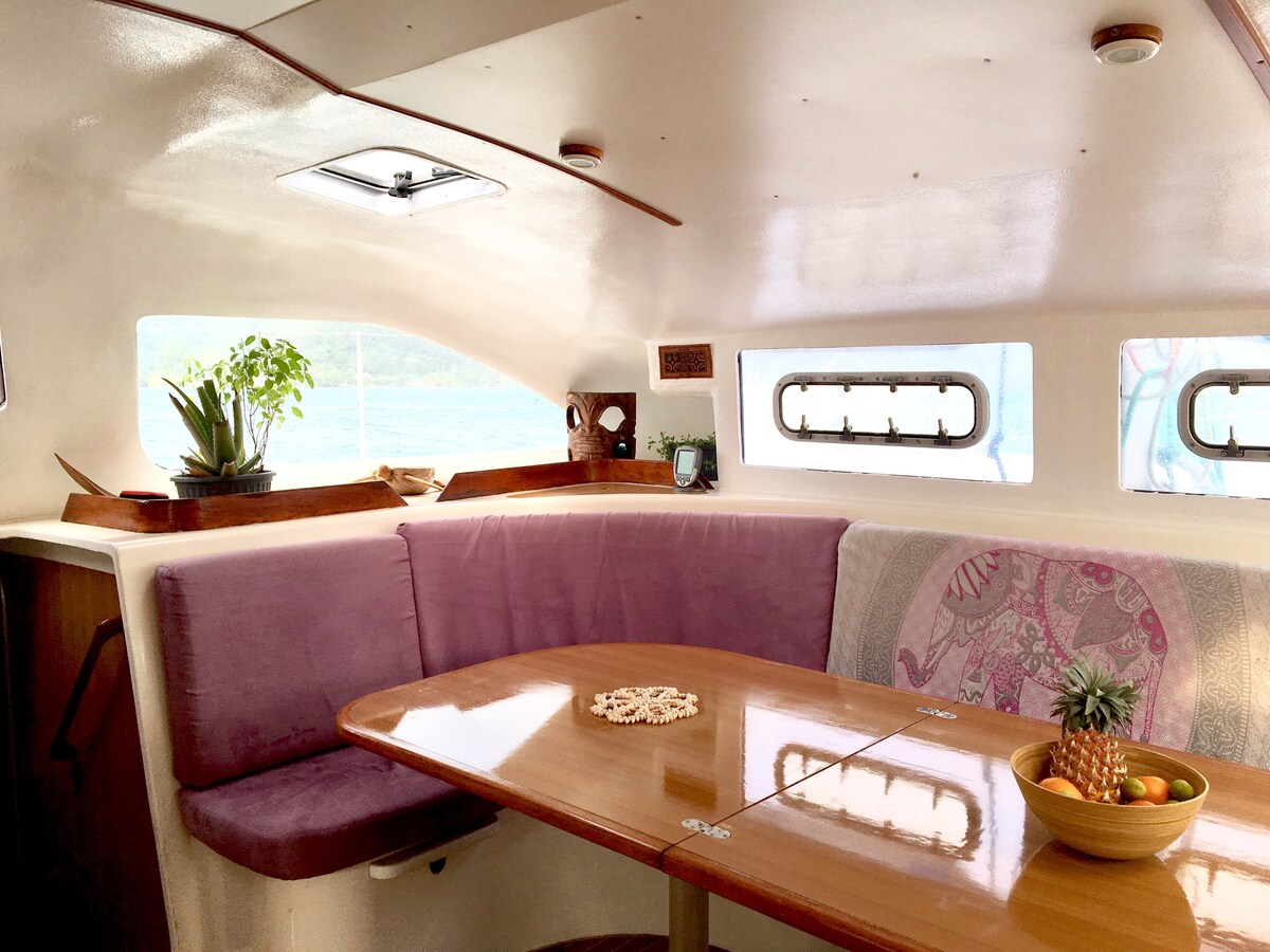 Anchored in turquoise water in the middle of the lagoon, close to the Toopua motu, no mosquitoes, no noise, no nuisance. Quiet and heavenly. Paddle and snorkeling equipment, dinghy to reach the land (extra fee).