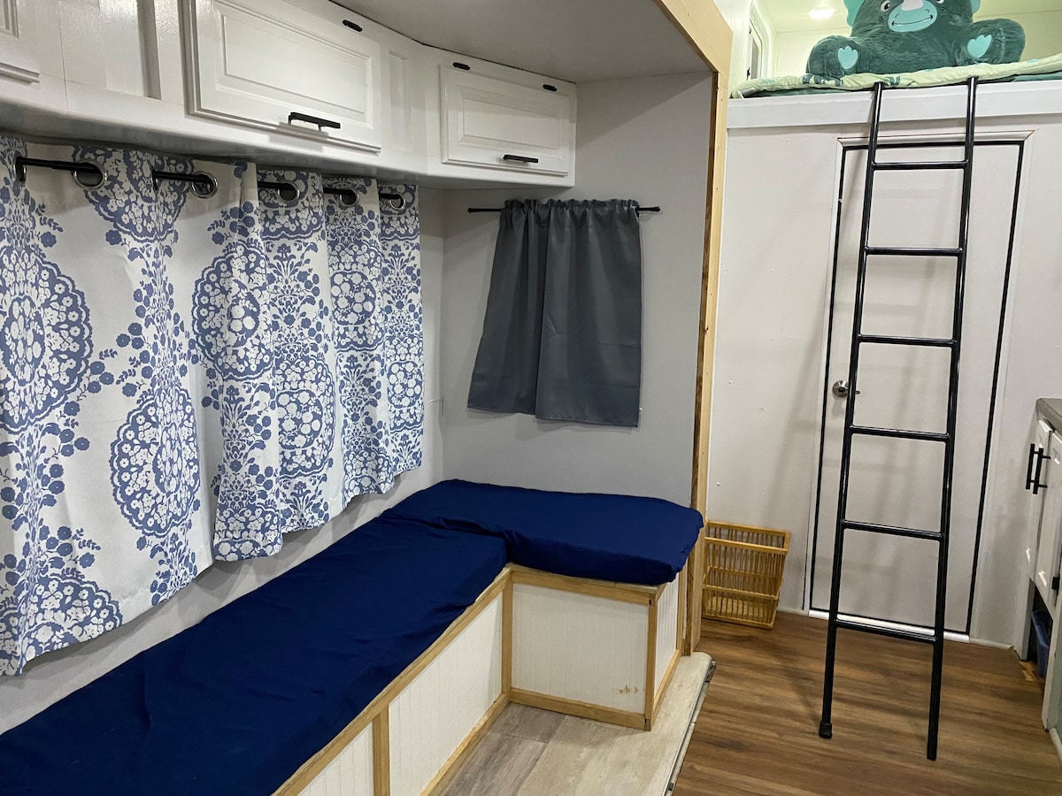 This cozy RV features high speed wifi to run all your devices, 1 bedroom - with a queen bed and the other sleep area has a full size bunk bed.