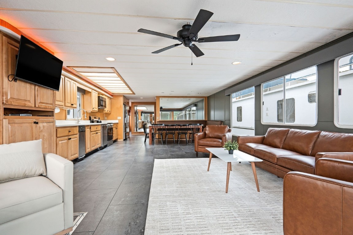 The heart of the houseboat is its welcoming living area, complete with a full kitchen equipped with modern appliances, including a dishwasher. Prepare delicious meals with ease and gather for dining with breathtaking lake views from the dining area or expansive deck.