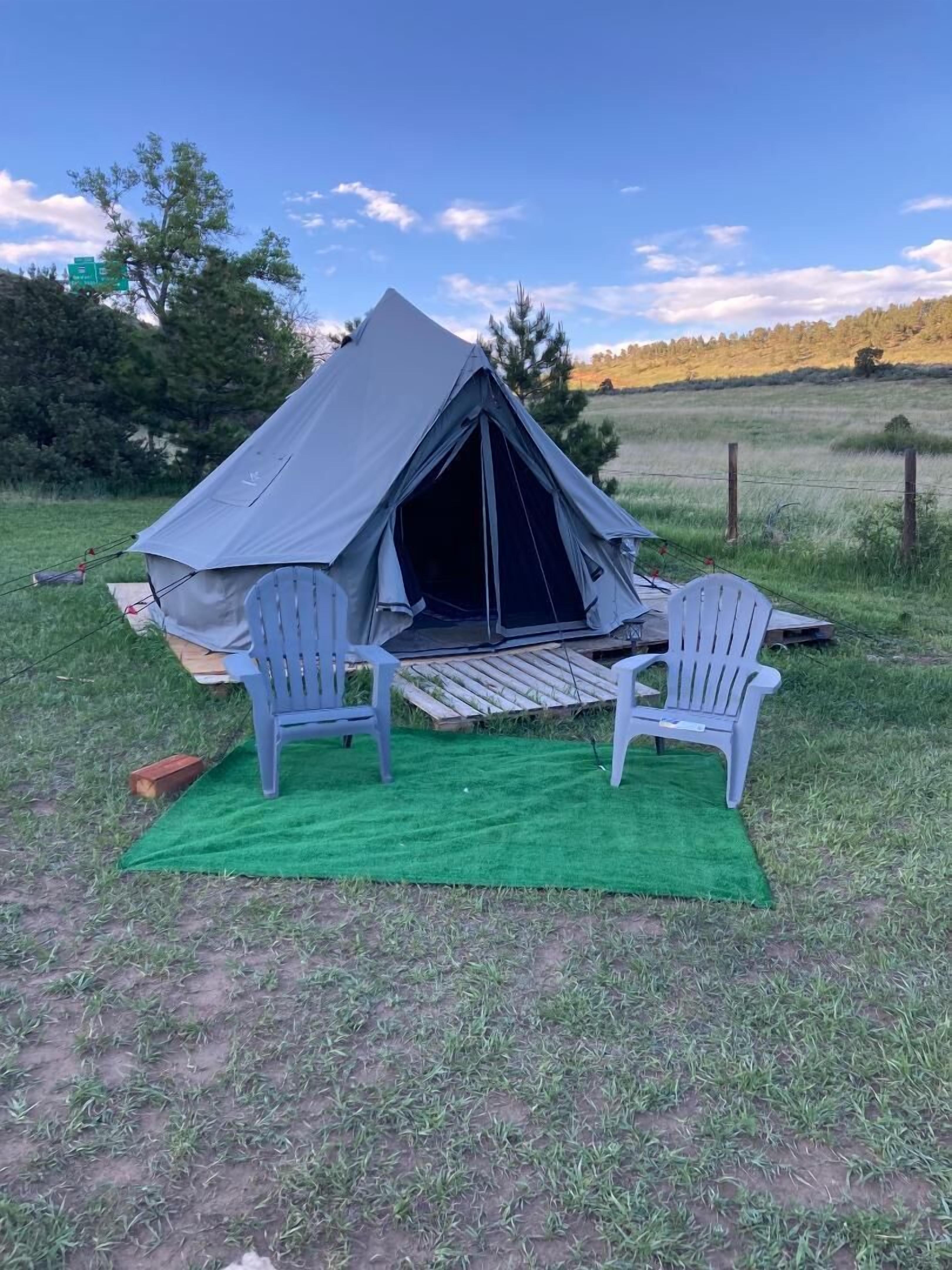 Please note : there is a full size off the ground bed. Can sleep four but 2 is more comfortable. We are have clean porta potties . The Glamping Tent can be driven up to. It does have lights in it. It is on a deck not the ground. It’s a yurt with a bed don’t expect to much :)