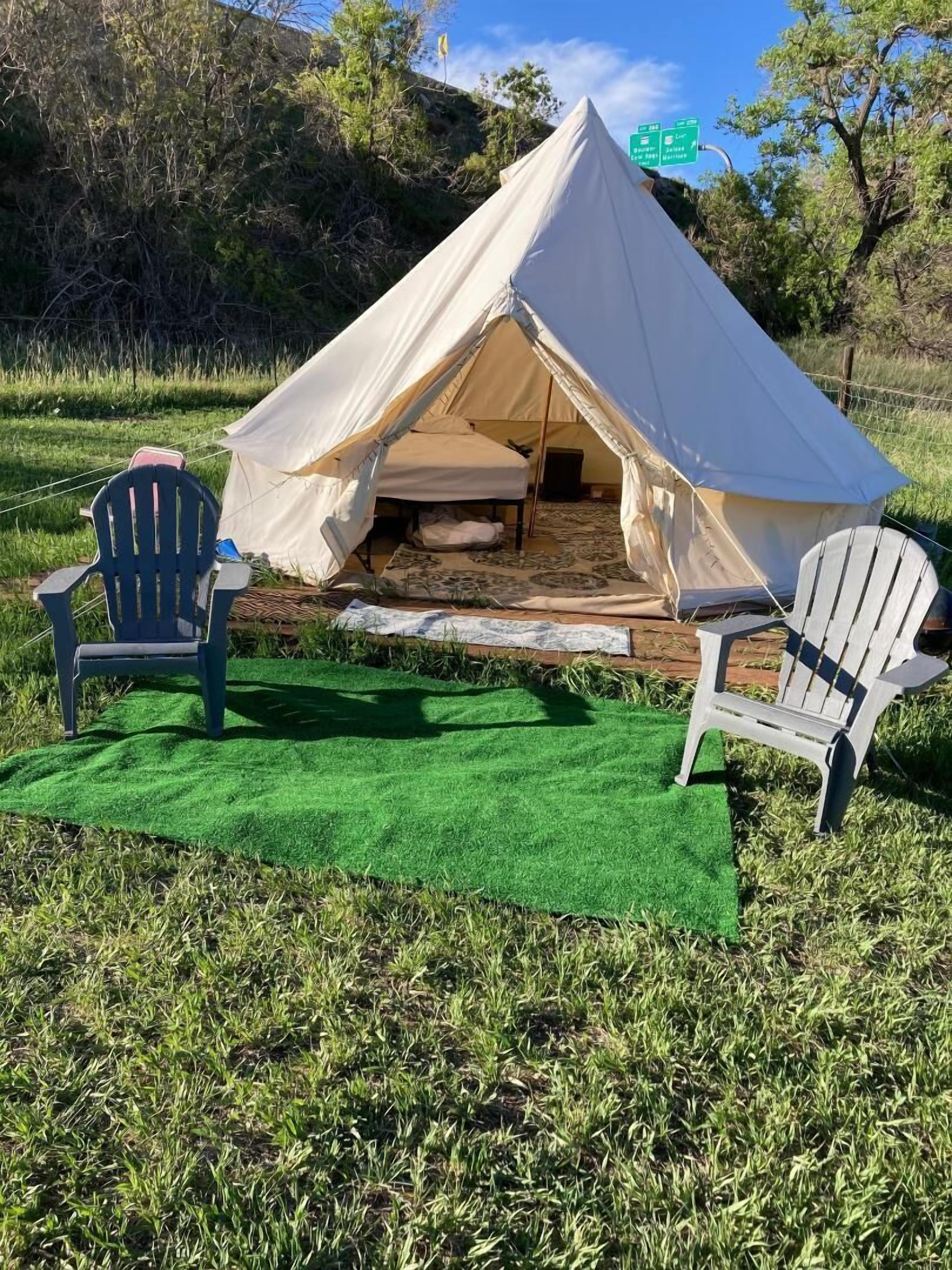 A 10x12ft luxurious canvas tent on 3 acres with a view to the Hogback Ridge is within 1 mi of the world-renowned Red Rocks Amphitheater. The tent offers a queen size bed, a deck with outdoor seating, a BBQ and most important a heated mattress pad. Discover the perfect blend of comfort and nature by booking your visit with us today!