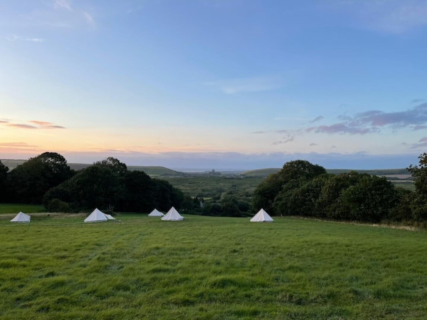5m Deluxe Bell tent in a private and unspoilt location with fire-pit, positioned to enjoy the unique view of Corfe Castle and beyond (as seen in the photo). You will love the view, which has to be one of the best in the area. You will appreciate the quality of the equipment and facilities combined with the tranquility, wildness and privacy of the location. You are in easy reach of many attractions including the local pub which is a short walk/drive up the hill.