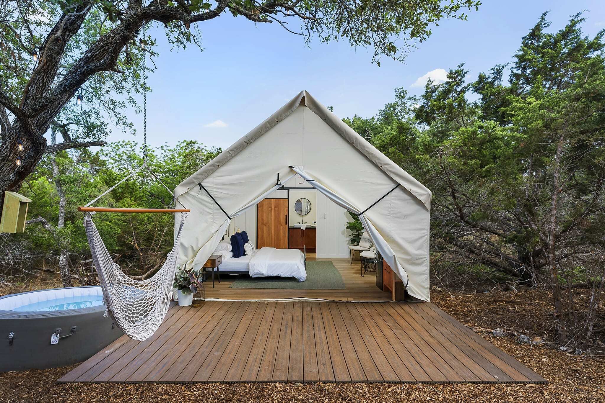 Welcome to Oak Retreat! Oak Retreat is luxury glamping at its best, located just 15 miles south of downtown, our tent includes a king size bed, A/C, en-suite bathroom with walk-in shower, private hot tub, coffee, wifi, and more. Relax outdoors, take a nap in your hammock chairs, indulge in a soak in your private hot tub or snuggle in bed while you watch a movie on your own projector. Oak Retreat has everything you'll need for a relaxing stay in the hill country.