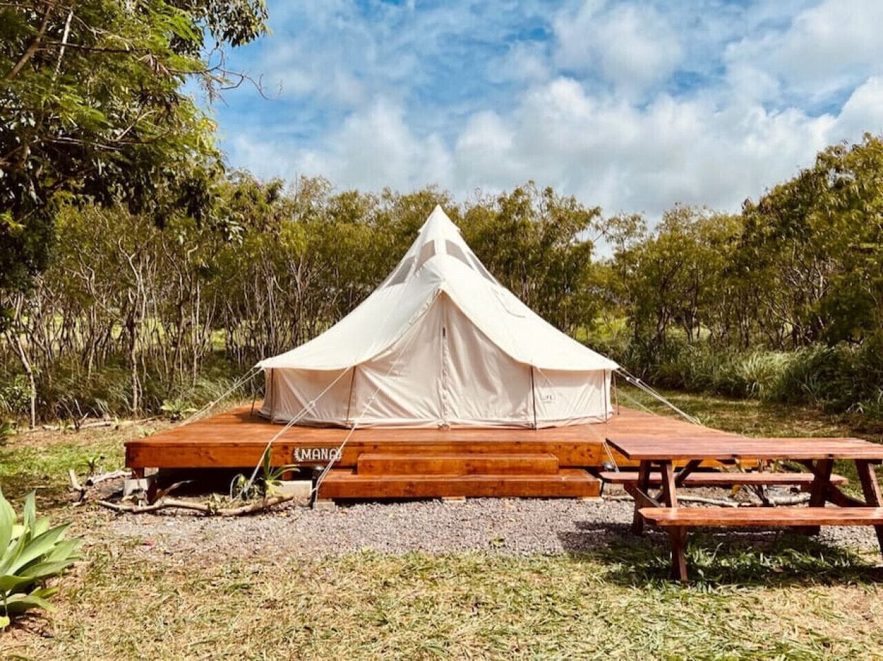 The tent is only half a mile from the start of the Laie Falls hiking trail, and surrounded by other walking or running routes such as the Gunstock Ranch bike path along Kamehameha Highway. While you may prefer the tropical greenery, you also have the option of venturing just 0.4 miles up the road to Hukilau Beach Park. This large stretch of sand is quaint and uncrowded. While you're in the town of Laie, you must make a trip to the Polynesian Cultural Center, or adventure further along the North Shore and visit popular spots such as the Kahuku Sugar Mill and Haleiwa town.