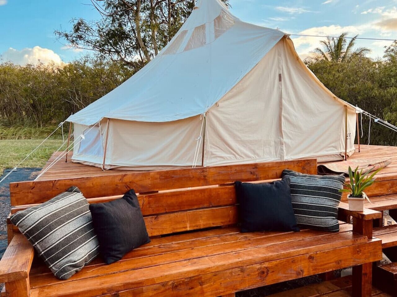 This listing is for a 16’ Stargazer Bell Tents sitting atop a wooden platform nestled in a grove of Hale Koa Trees. The Stargazer tent allows you, on a clear night, to stargaze through the tents skylights. And the view out the front of your tent is of green pastures, horses and the ocean. Your tent is fully furnished with all of the same comforts you would have at home. Queen sized bed with linens, nightstands, seating, clothing storage, twinkle lights. (Duracell Generator on request for an add-on).