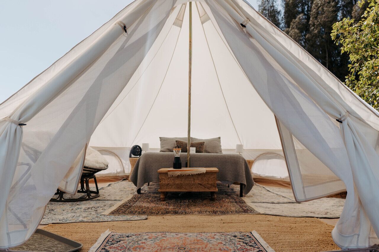 Enjoy comfort and luxury glamping in canvas bell tents on a working horse ranch. With exceptional ocean views and lush green pastures, your stay will be one to remember.