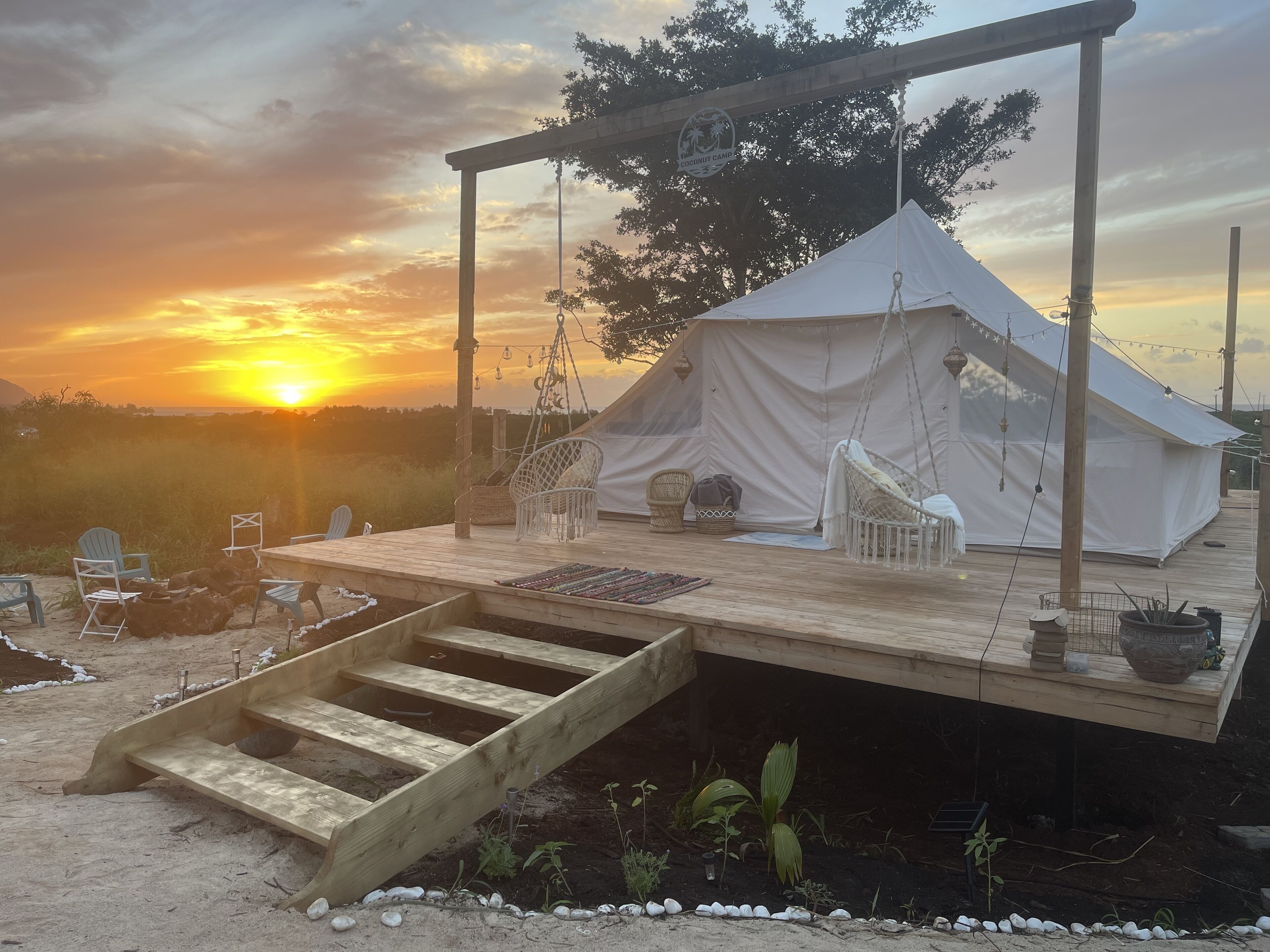 Stay in a cozy 4-meter dome tent in Laie, Hawaii, with stunning sunset views over the mountains. Inside, enjoy a queen bed with fresh linens and solar-powered lighting for an eco-friendly retreat. Guests have access to a shared bathhouse with a sink, toilet, and shower. Just minutes from beaches, surf spots, and the Polynesian Cultural Center, this is the perfect getaway for couples or solo travelers looking to relax, explore, and experience the beauty of Hawaii in a unique setting.