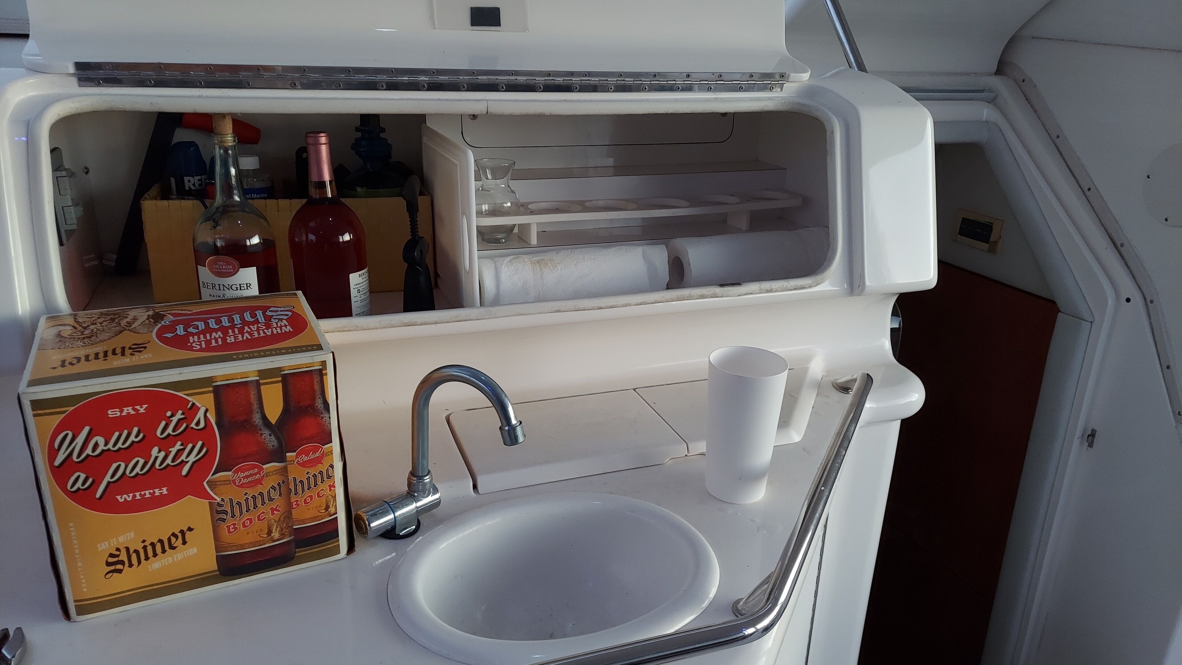 OK, you are looking at a gorgeous 38 aft cabin Sea Ray yacht. It is moored in a slip and Does Not Move. There are full amenities at the marina including pool with swim up bar, fitness center, washer/dryer, restaurants and lounge bar. The boat has 7 total sleeping areas including the slide out salon couch. Master suite is in back, V berth in front and a solo cabin under the corner couch. Full galley with fridge, micro, toaster oven, 3 burner stove, mixer, double sink. Two full baths, hot showers. TV, internet, outdoor lounge cockpit wet bar, flybrige, icemaker, gas grill. Safe parking, and courtesy carts. Complete privacy at the end of the pier. 3 ACs provide plenty of cool dry air. Unlimited hot and cold water. Minimum 2 nights stay, plus a cleaning fee. Not recommended for more than 4 people, but can sleep 7. No children under 12 please.