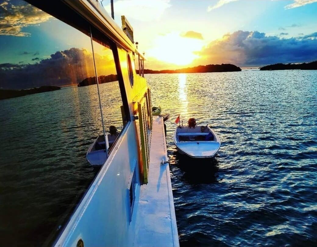 After 2 years and 200 reservations posting my Houseboats on airbnb, I am very great full for the ones that appreciated life off shore, but decided that anyone is not ready for a Salty get away, sold all my houseboats and took a long break , now I am back with a green powered Houseboat. Solar panels supply the energy for a small refrigerator, access to WIFI, full kitchen, outdoor grill, bathroom with compost toilet and shower ( No hair dryer), queen bed, roof deck for cocktails.