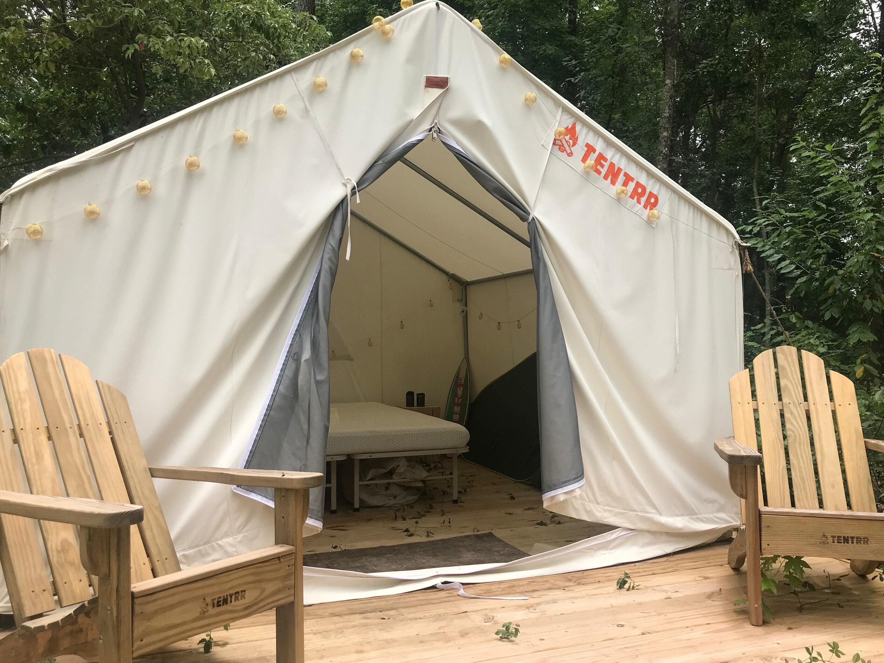 Each campsite includes a 10'x12' safari-style canvas tent on a raised platform, and you'll find one queen bed or a queen-size bunk bed inside (each site is different, see photos for the exact setup). Larger groups can also use the extra 5-person pop-up dome tent that’s provided (you’re welcome to bring your own camping gear too). You'll also have a 6-ft picnic table, outdoor fire pit, 2 Tentrr Adirondack chairs, and a heating source to keep you warm and toasty at night.