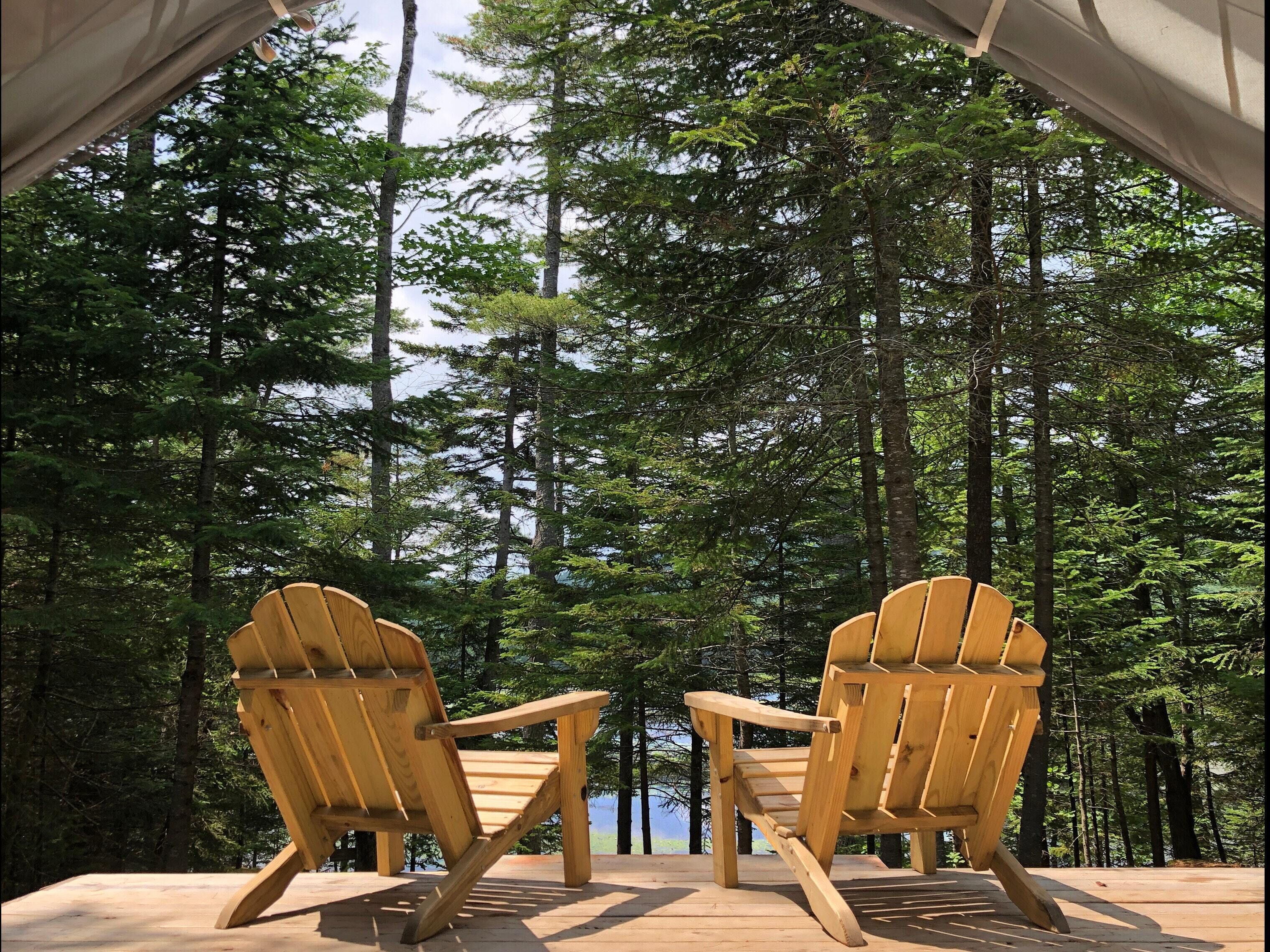 Secluded two-person main tent nestled in nature.. steps away from hiking trails, boating, and fishing. Listen to the wind in the pines, and the loons on the lake. No motor boats or jet skis to disturb the solitude. Take a peek at instagram.com/campthepines