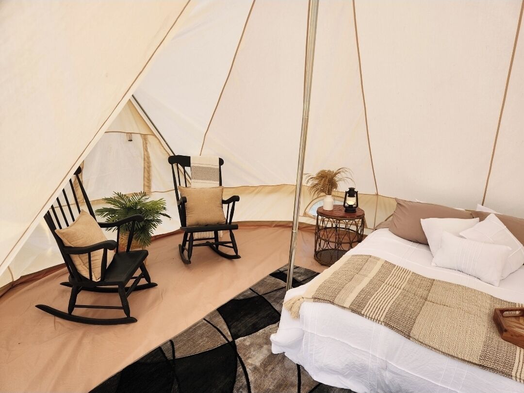 This glamping tent includes one queen bed and a cot. Infant crib and additional cot available upon request.