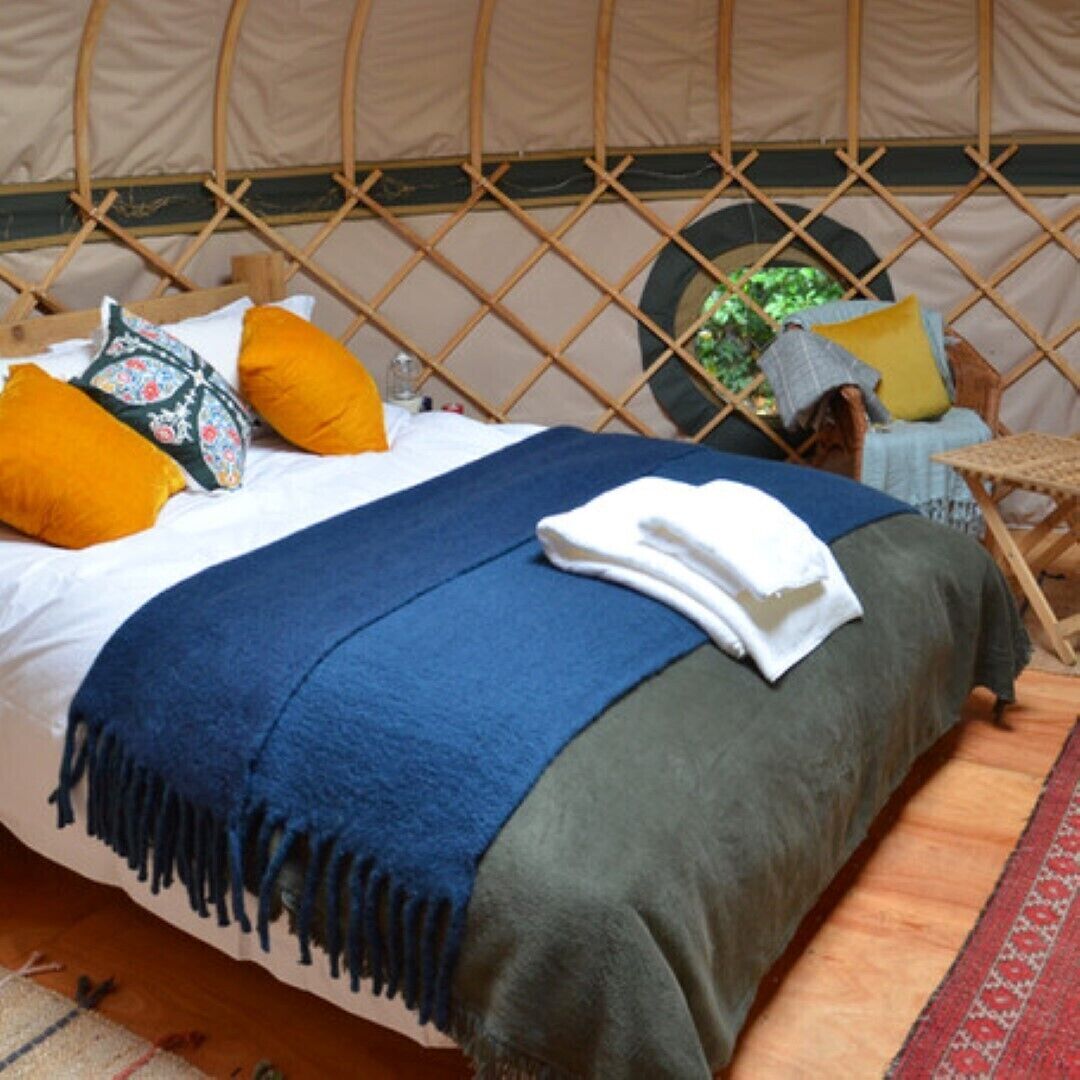 The beautifully handcrafted Orchard Yurt made from English ash is a perfect retreat for all seasons. 16 feet in diameter, it is fully insulated and heated by a wood-burning stove and electric heater with a king-size bed made from reclaimed English oak, a futon and an optional single bed. Cosy duvets, crisp linen, towels, tables and throws are all provided and fairy lights inside and out. There is electricity and free Wi-Fi, books, games and lanterns. And finally you will find your surprise welcome hamper with snacks and drinks for your arrival! Orchard Yurt Site is nestled between plum, apple and pear trees and has its own kitchen, barbeque, hot tub, firepit, eco loo and seating area.