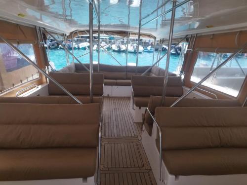 she has 3 luxurious cabins with port hole, mirror, cupboards, music system, quality bedding and with ensuite bathroom, she can accommodate up to 6 guest, large saloon with TV, music system, DVD, indoor dinning table