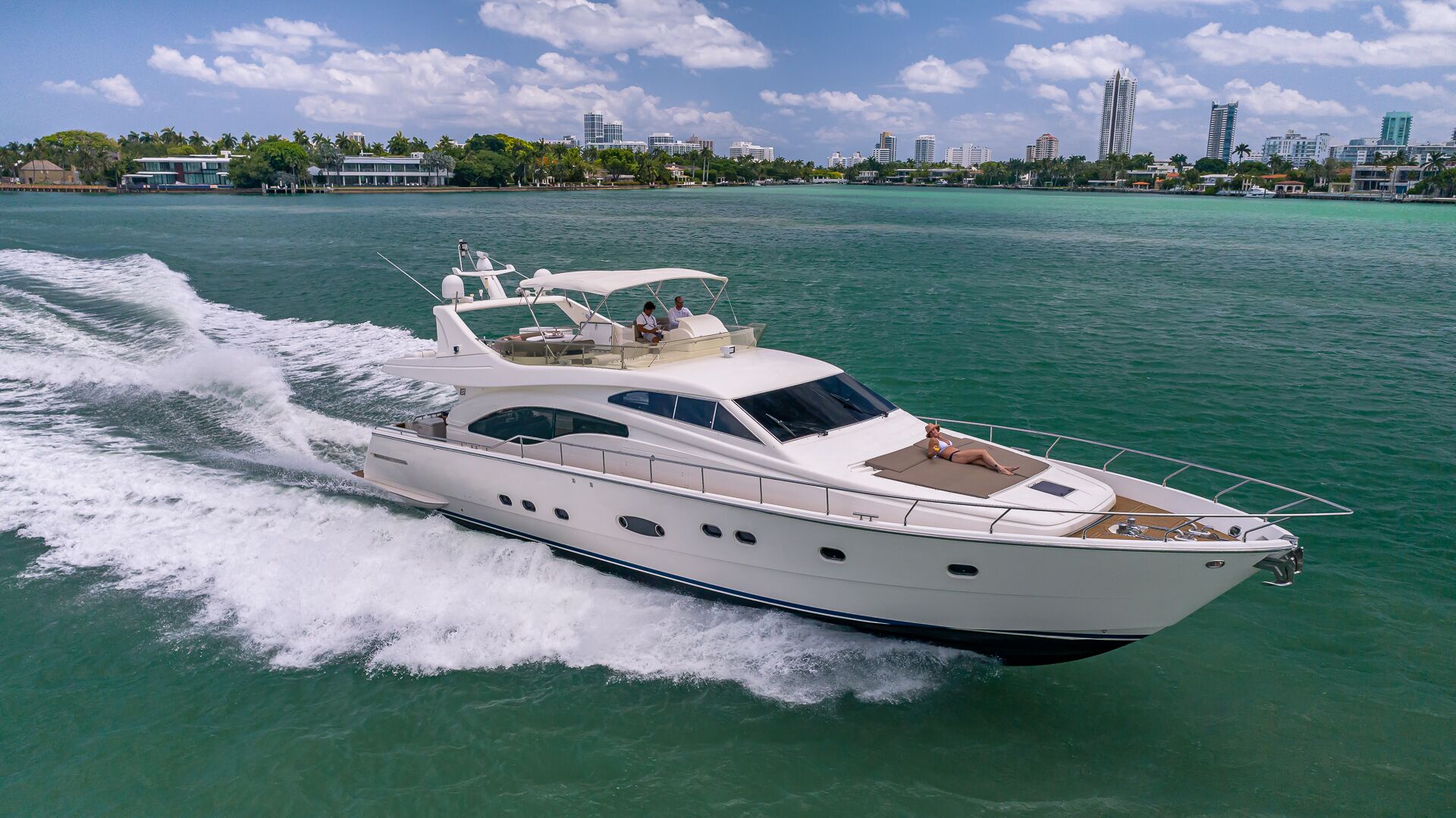 Beautiful 75 ft Ferretti yacht with 3 bedrooms and 3 bathrooms, Large living area and fly bridge(second floor)! You can use it as a place to stay for the night and or you can rent it for local cruising with our captain and stewardess included for $750 per hour.Cruise around Miami, beauful sight seeing, go swimming ,eat and play music, order jet skis,,