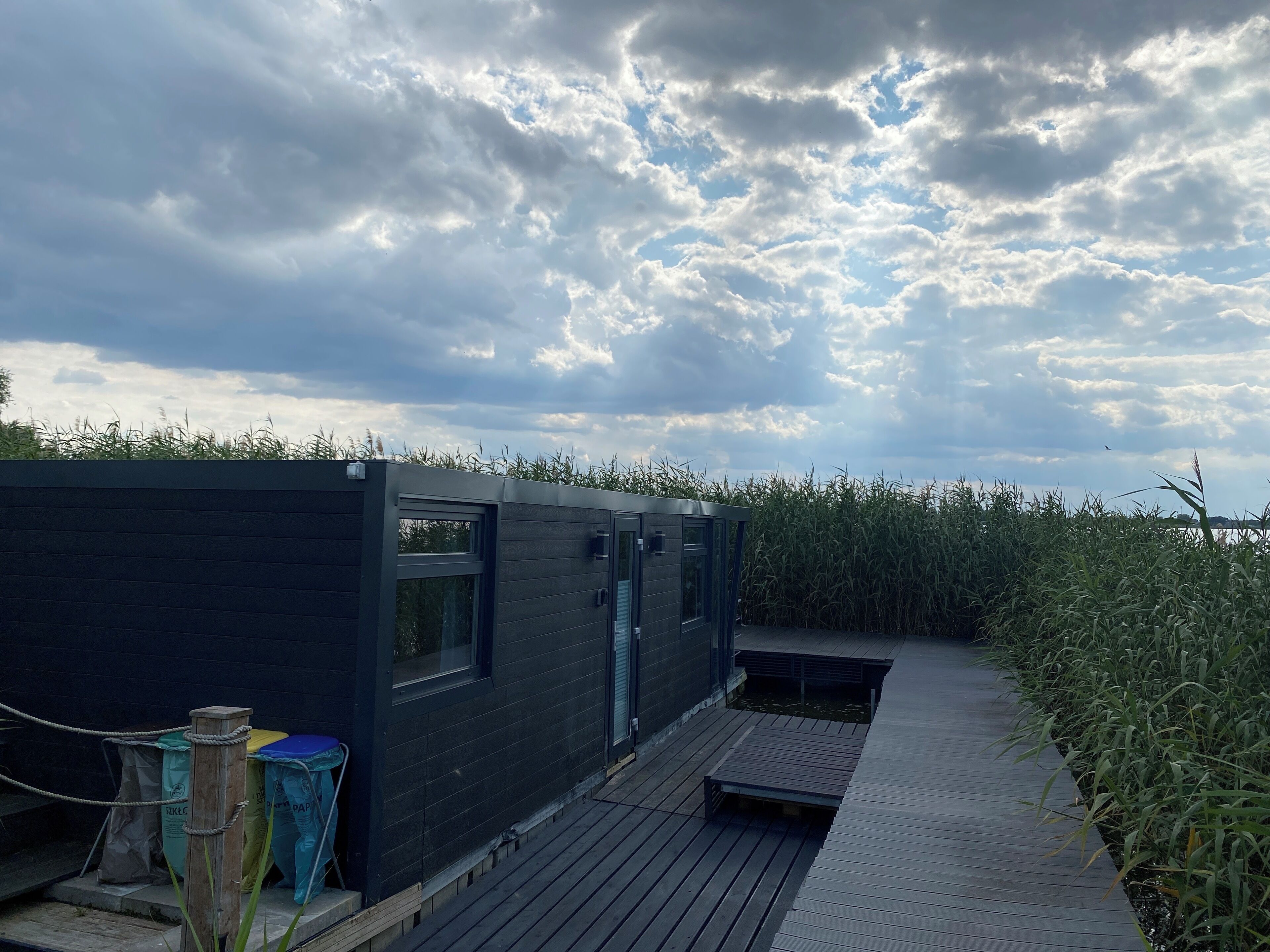 Houseboat is a charming, spacious cottage designed with comfort and relaxation in mind. Its unique location on the water creates an unforgettable atmosphere and allows you to enjoy the peace of nature. The large terrace on the roof of the house is an ideal place to relax outdoors. There is comfortable furniture where you can sit, relax and enjoy the beautiful views. On the ground floor of the house there is a covered terrace with garden furniture, which offers additional space for relaxation and outdoor meetings. It's the perfect place for a morning coffee or an evening drink overlooking the water. The house on the water is equipped with air conditioning and heating, which makes it comfortable and friendly for any season. Regardless of the weather, you can enjoy a pleasant temperature inside the cottage. The recreation center is beautifully located directly on Lake Jamno, about 200 meters from the sea, right next to the forest. The plot is covered with old trees, Guests have at their disposal a free parking lot, a playground for children, a place to light a bonfire, a grocery store, a motorboat cruise and a rental of: bicycles, water bikes, electric scooters, water bikes and a barbecue. There are shops, restaurants and bars nearby. Łazy is a small and quiet seaside town, surrounded by lakes and forests, a perfect place for people looking for relaxation surrounded by nature and away from the crowds. Surrounded by the calm sea, fresh air and breathtaking landscapes, guests can fully relax and break away from everyday worries. Numerous bicycle paths allow guests to explore the area on two wheels, enjoying the beauty of nature.