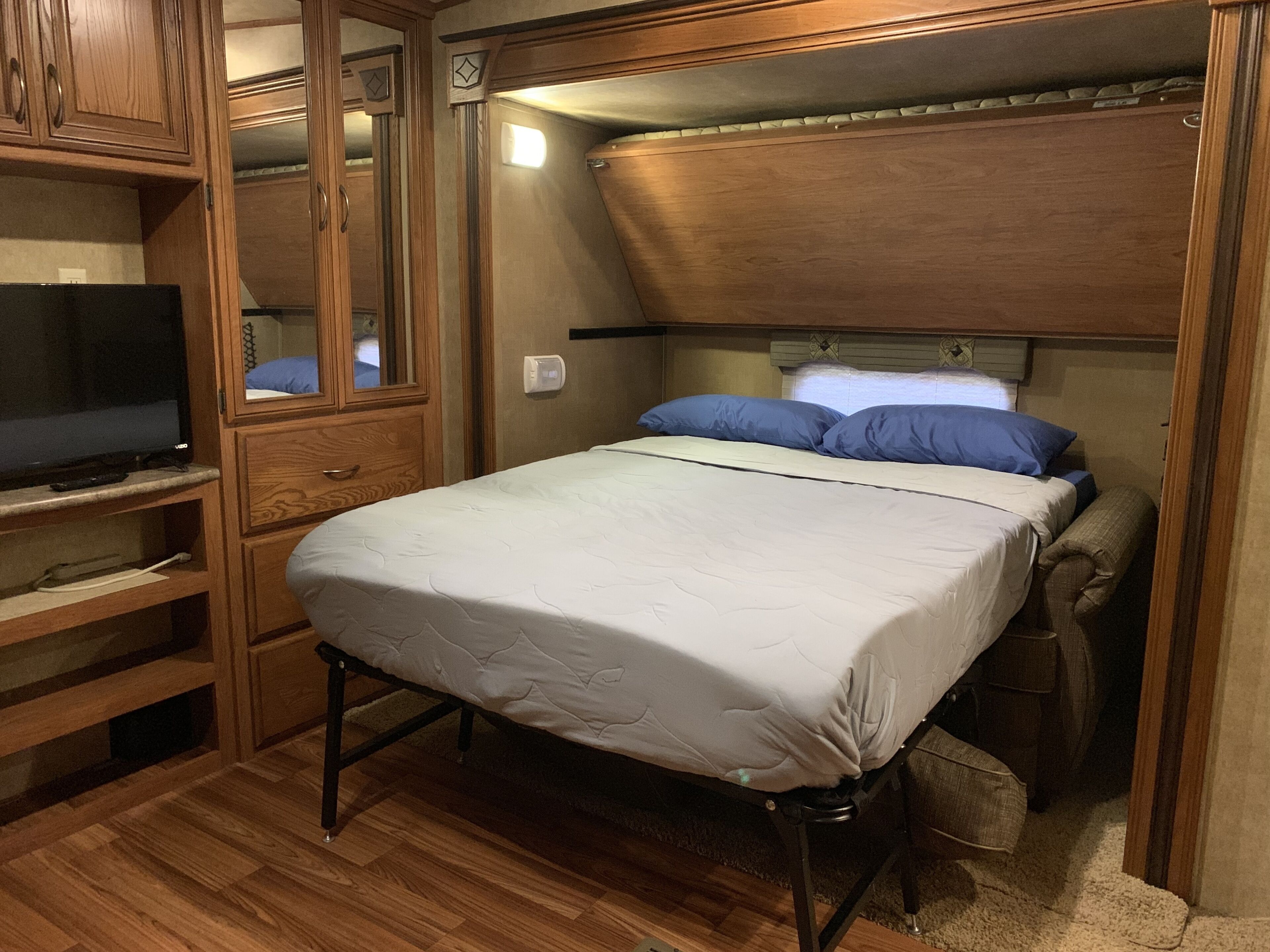 42ft 5th wheel camper sleeps 4-5 people comfortably. Sleeping arrangements include a king bed in the bedroom, 2 couches in the living area and an optional queen air mattress (portable playpen available upon request). This camper offers a full-size residential refrigerator and the kitchen is fully furnished for your convenience.