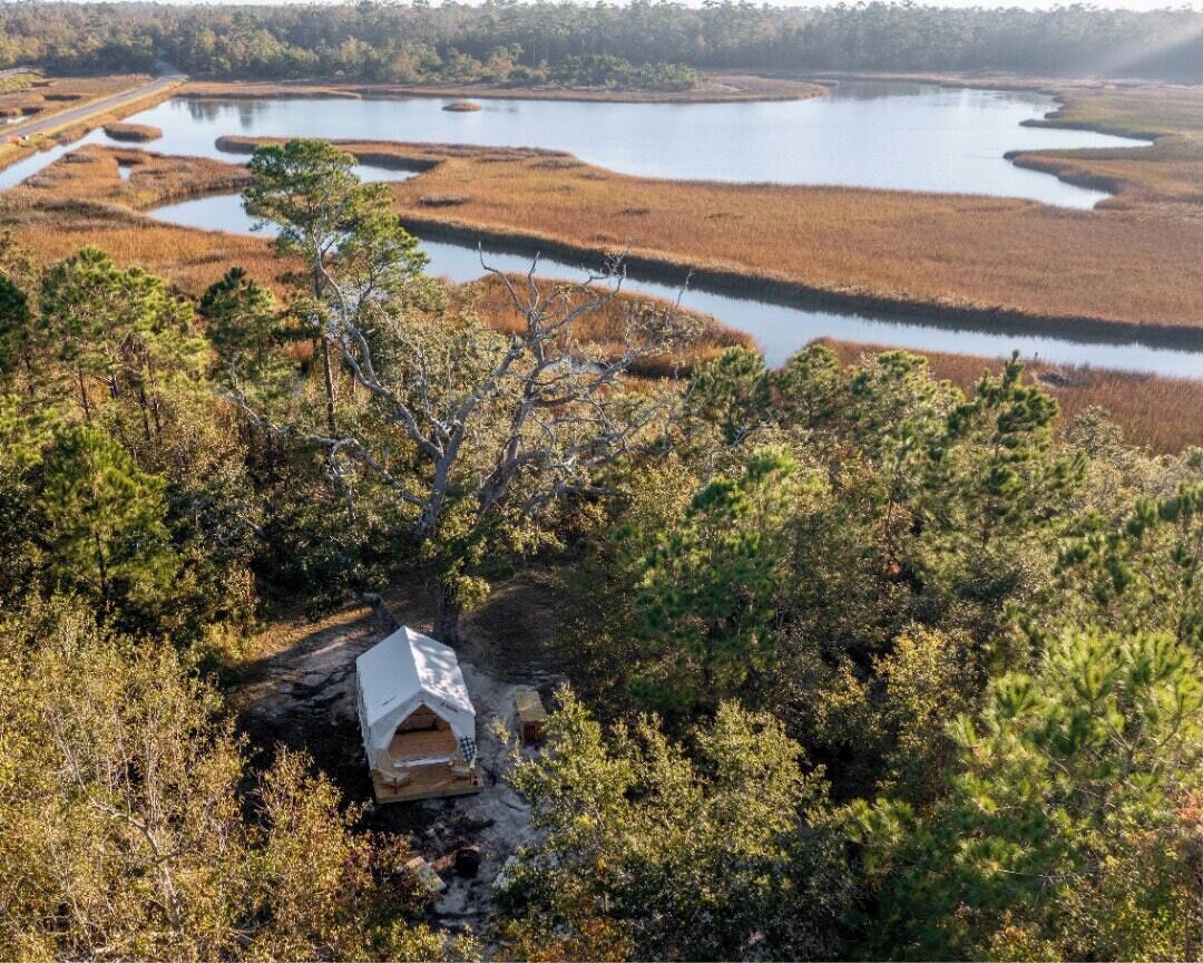 Campsite with a platform safari tent near Gulf of Mexico beach and waterpark