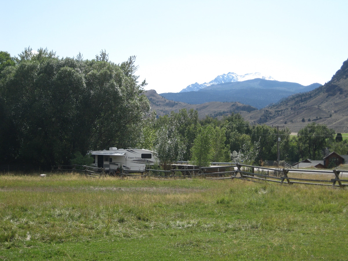 Extremely Unique Yellowstone Experience. This 29' Fifth Wheel Keystone Cougar RV sits on a solo sight on our ranch in Paradise Valley. It has full hookups and the area is completely yours. There are no other renters, campers or RV's on location. The location is just 10 miles from Gardiner, the North Gate to Yellowstone. Near enough to be a convenient access to the park and far enough away to escape the hustle of a tourist town.