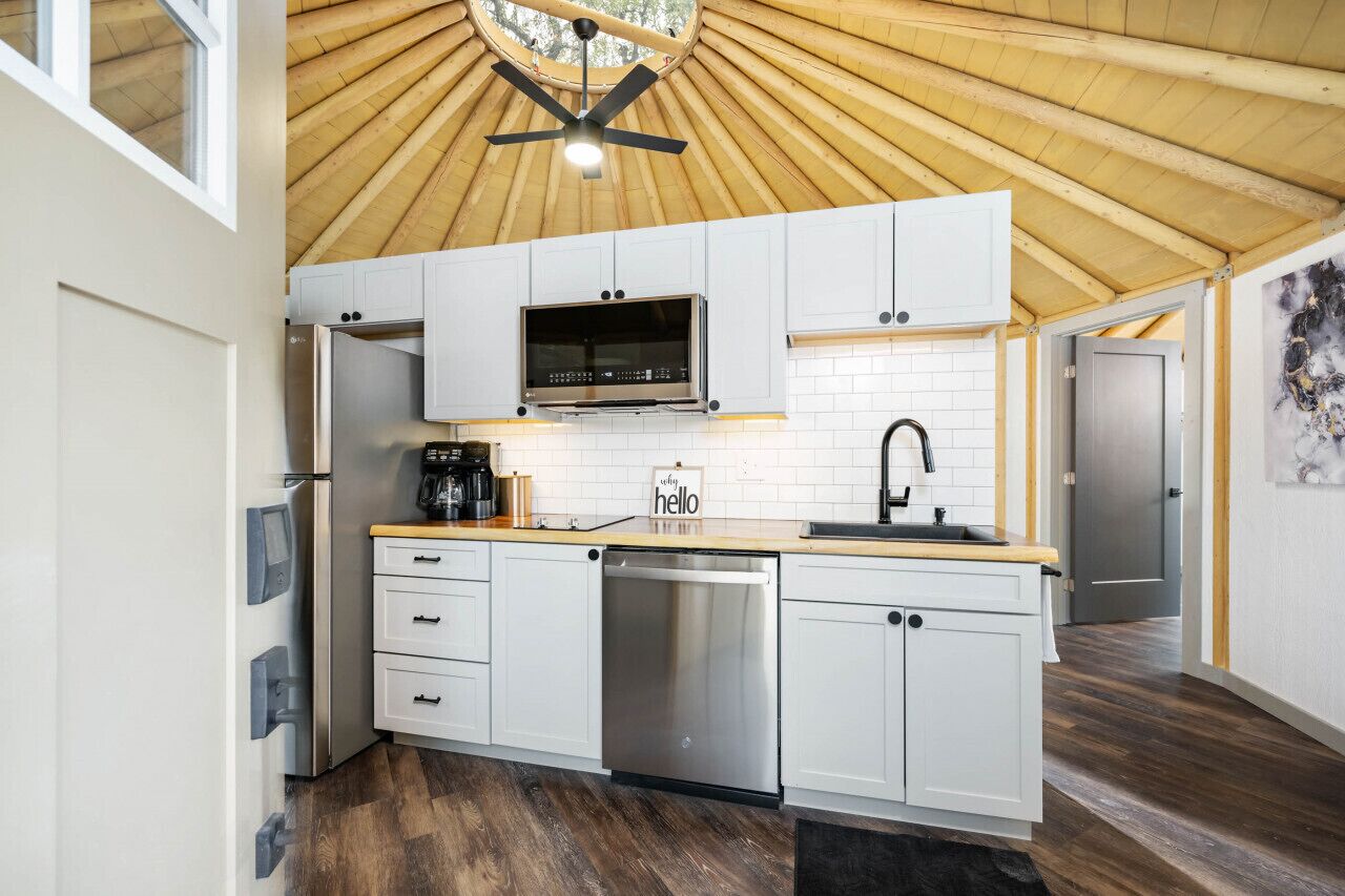 Ophelia was designed to be the perfect honeymoon getaway! The ONLY unit with an attached additional Yurt-Cabin bathroom, guaranteed to catch your eye! With extra secluded privacy to the back porch and patio, two person occupancy, and thoughtful additions for a perfect couples vacation! Take a dip in the large soaking trub or in the hot tub, the choice is yours!