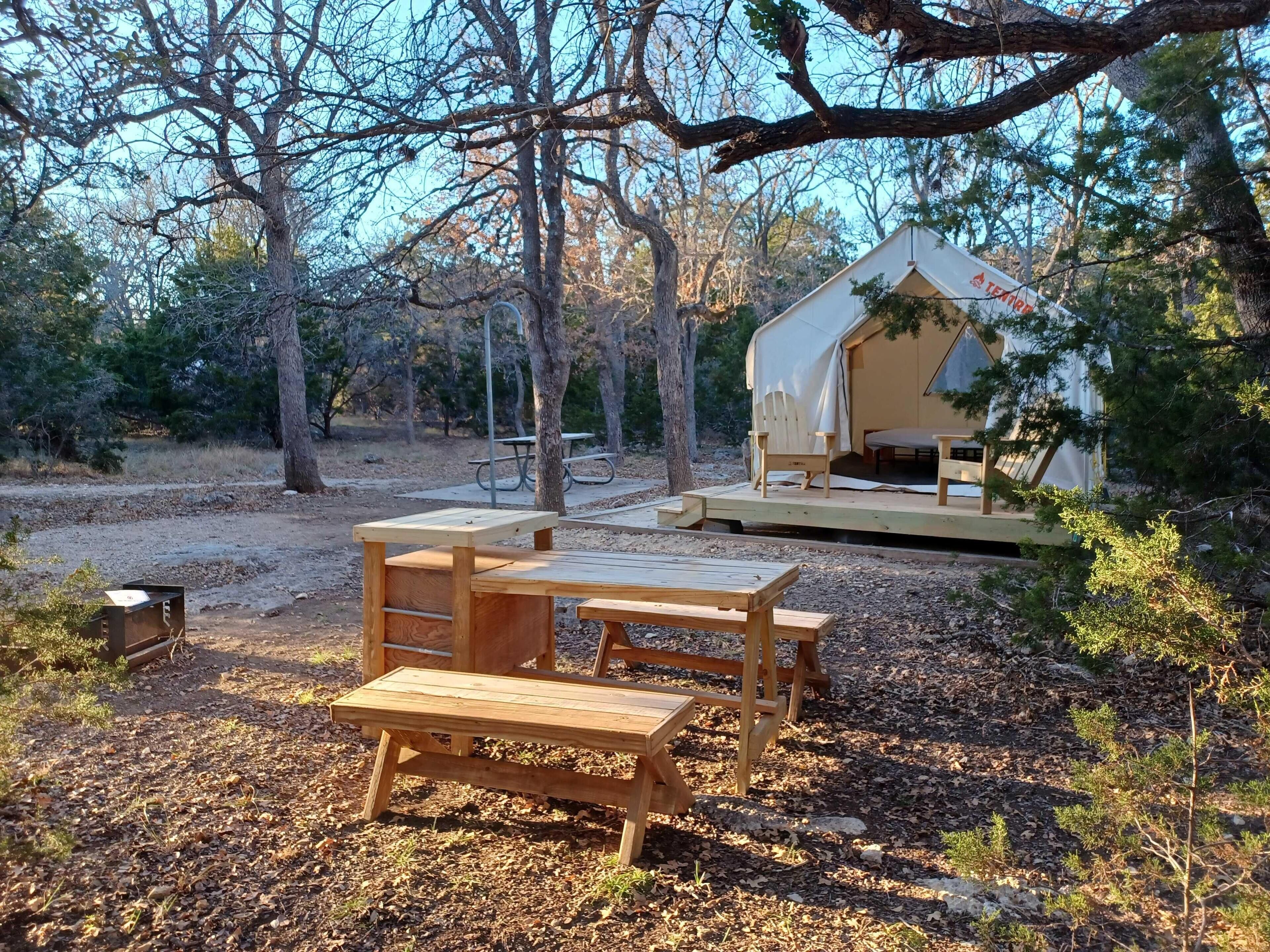 Come out to Rebecca Creek Campgrounds for a relaxing getaway in our Glamping Tents each w/ Queen Bed, 2 cots for family or friends complete with linens, pillows and blankets, table and chairs, carpets and a few creature comforts! Each site also has a electricity, heat, fan, picnic table, firepit and grill, plenty of parking and walking distance from Portos and River Access.