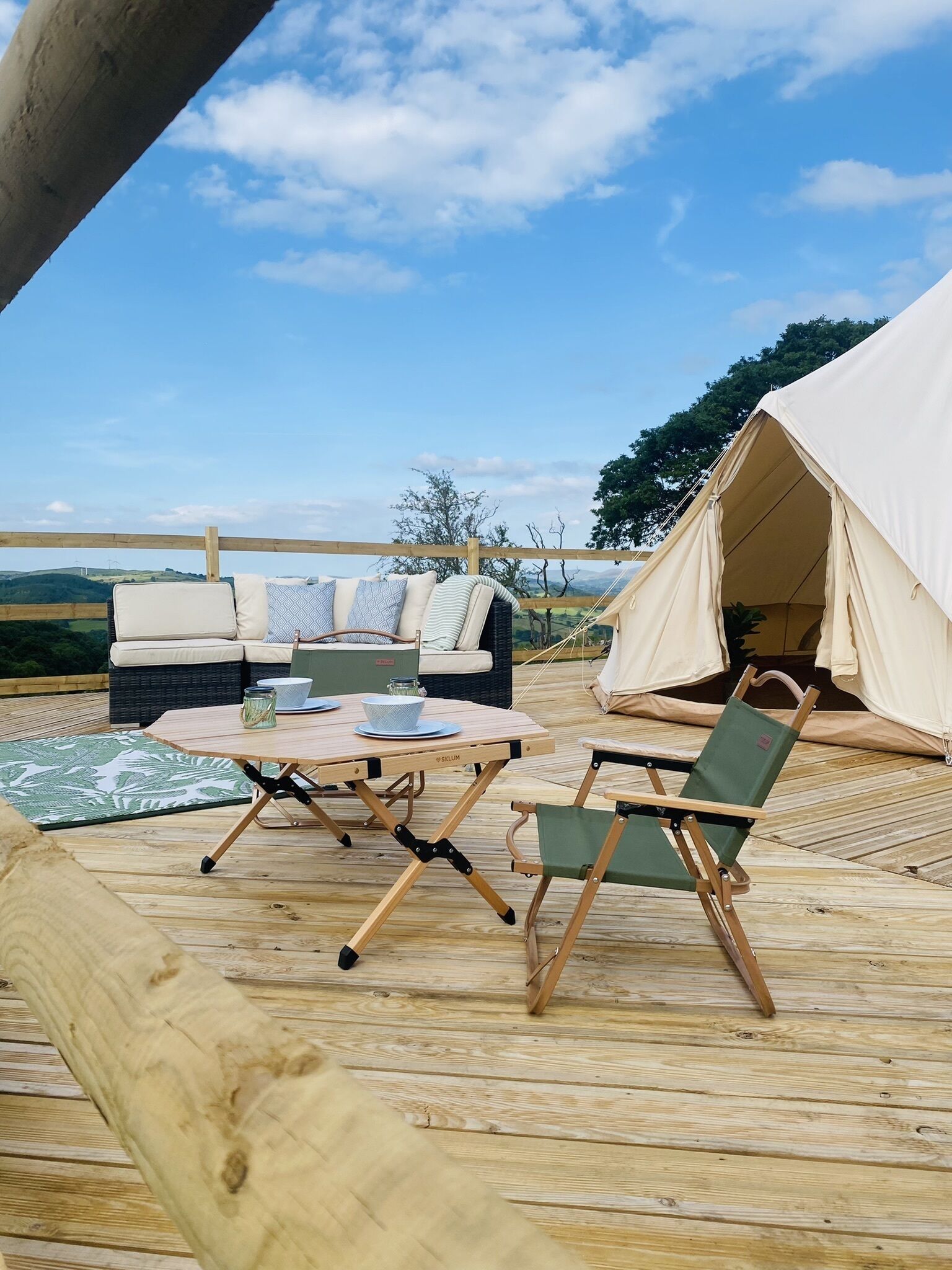 Summers View is a 5mtr luxury Bell tent on it's own private decking area where you can sit and enjoy a sundowner watching the sun go down behind Snowden. Set in our hobby smallholding you will have our pet donkeys, sheep and goats for company, but make sure you keep your gate closed or they may just join you. Summer's view has it's own shower and toilet and also a small kitchen and bbq. The feeling of peace and tranquility will make you want to stay forever. We are a small site with only 2 tents that are not in view of each other.