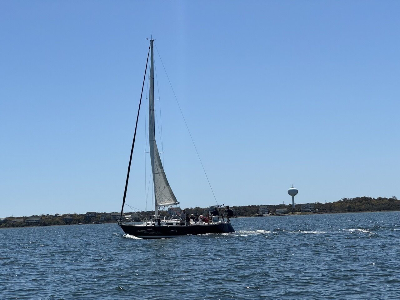 Our boat is at the dock and hooked to electric at the sailing center. We have shoreside shower and heads available for your use. We are located right across the street from Pops Raw Bar in Buxton and regularly sail Legacy out behind the sailing center for sunset cruises.