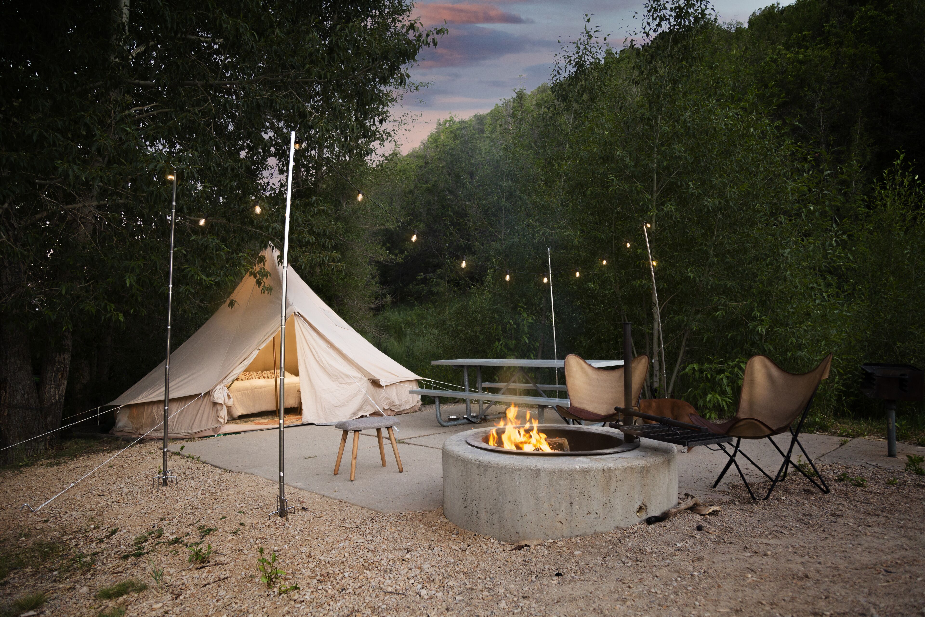All of Park City's Gypsy Glampsites offer beds that come with memory foam mattresses. The floors are covered with Moroccan style rugs and lit with soothing Edison light bulbs. There is a fire pit in each camp site as well as drinkable water spigots near by. There are also 2 hammocks set up just for you :)