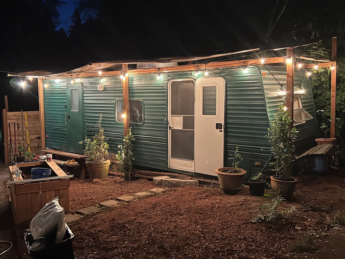 25’d x 8’w travel trailer that is permanently located near the main house. Queen bed (lifts up for suitcase storage), fold-out sofa, lots of storage and closet space. TV, Wi-Fi, Roku, fully furnished with the basics (dishes, bath products). Property manager will show you where your one parking spot is.