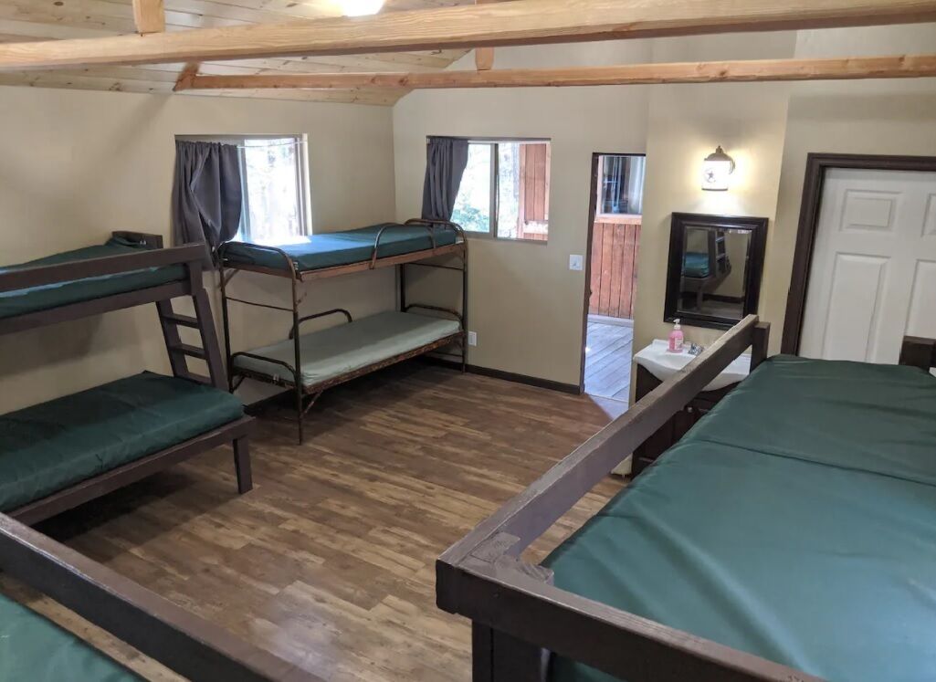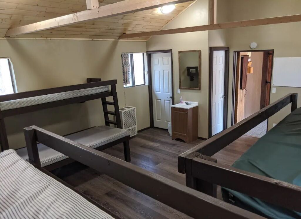 Your spacious cabin is fully equipped for comfort and relaxation. Amenities include a hot shower, flushing toilet, and numerous beds to lay your head at rest. The heater keeps it nice and toasty on those cold winter nights. When the weather warms up, opening up a window for a cool breeze is always soothing.
