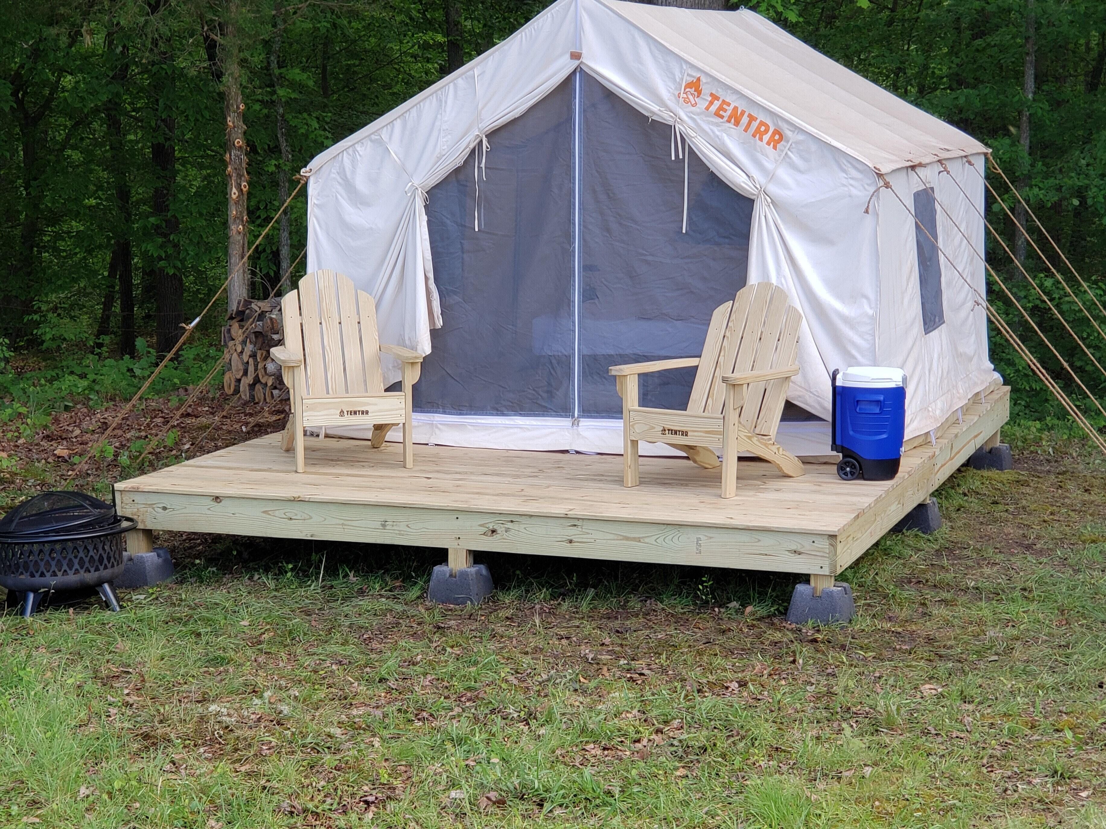 Each campsite includes a 10'x12' safari-style canvas tent on a raised platform, and you'll find one queen bed or a queen-size bunk bed inside (each site is different, see photos for the exact setup). Larger groups can also use the extra 5-person pop-up dome tent that’s provided (you’re welcome to bring your own camping gear too). You'll also have a 6-ft picnic table, outdoor fire pit, 2 Tentrr Adirondack chairs, and a heating source to keep you warm and toasty at night.