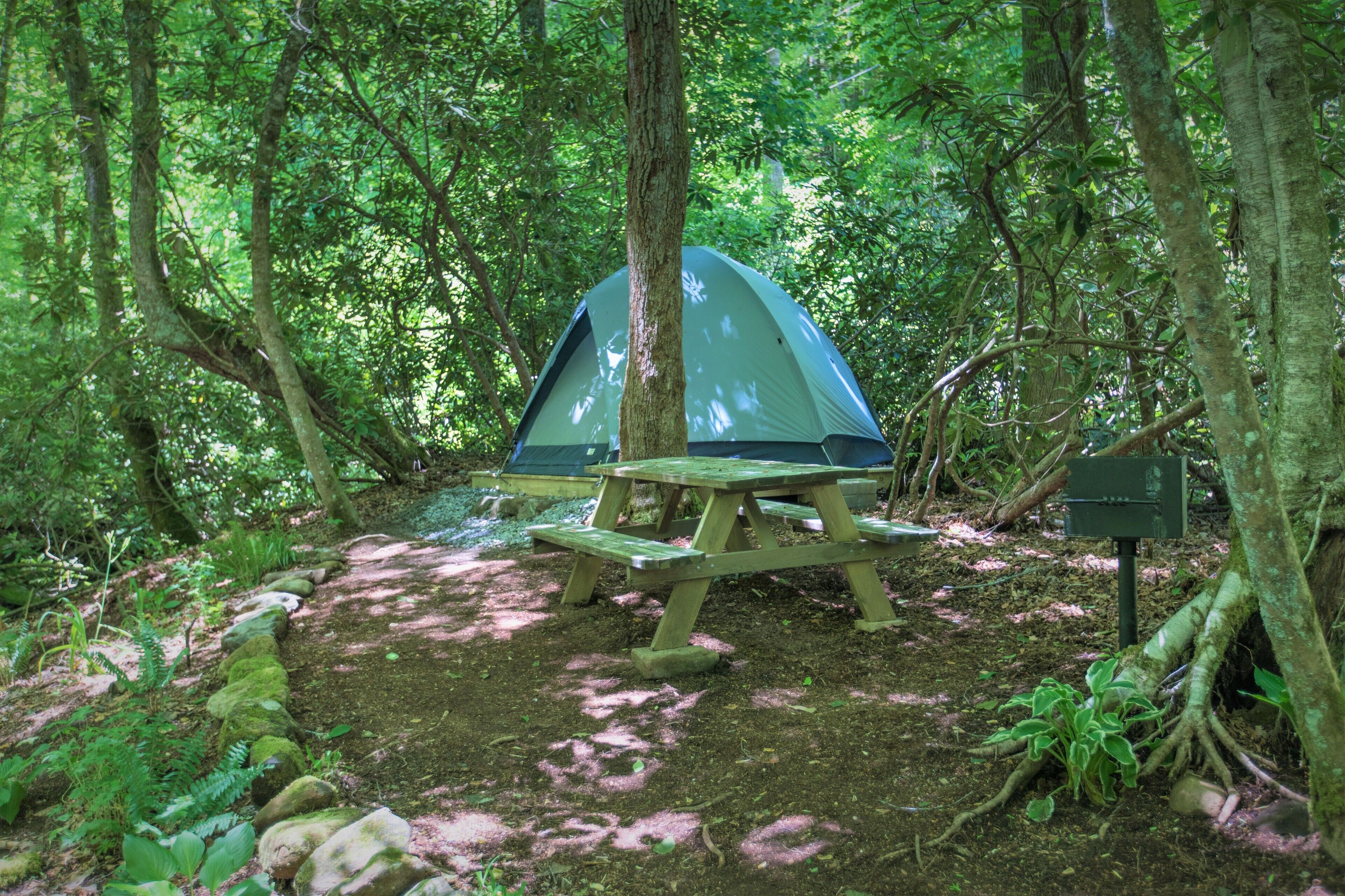 Enjoy the fresh, cooler mountain air in a beautiful, private setting! It is perfect for 2, but up to 3 additional guests is an available option! Heartstone is located on a gently terraced slope where a divided mountain stream, the tumbling Squally Creek rejoins itself! The sun light filters down through the forest canopy providing a warm, inviting glow!! " Like a fairytale", said one guest. There is a 9'-6" x 10' tent platform, a picnic table and charcoal grille, and comfort facility all within 30' of your private parking!