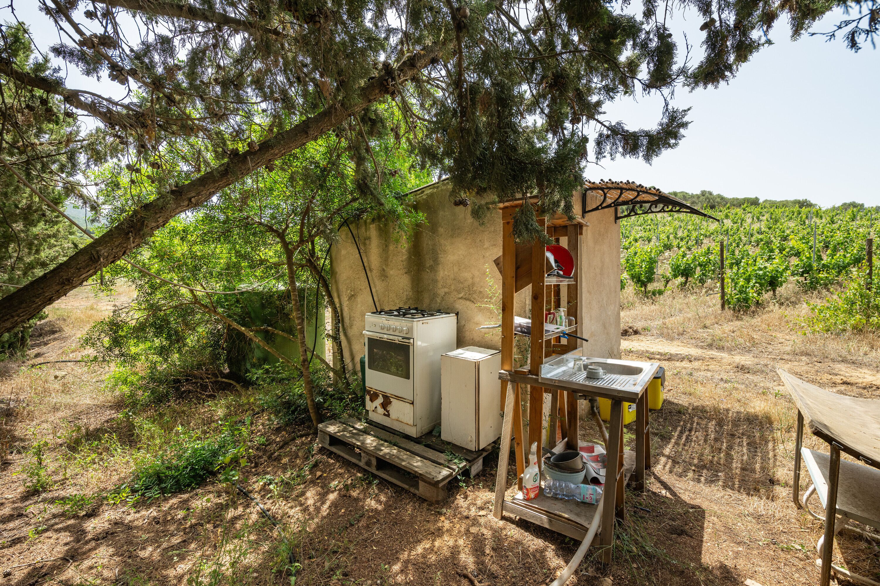 The private outdoor area is equipped with everything you need for a comfortable stay (table, chairs, outdoor kitchen, dishes, water fountain, electricity, fan, deck chair)