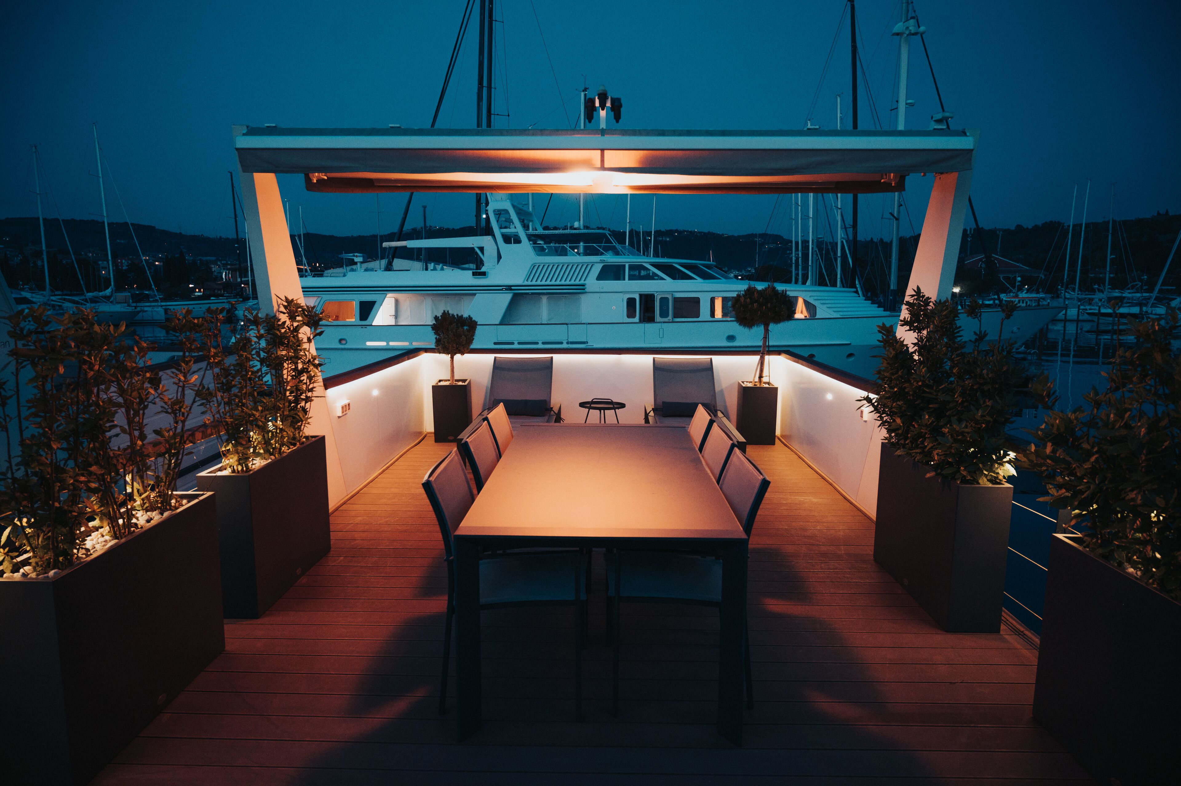 Open the sun shades on the roof terrace and have breakfast while enjoying a 360° view of glittering sea and green hills.