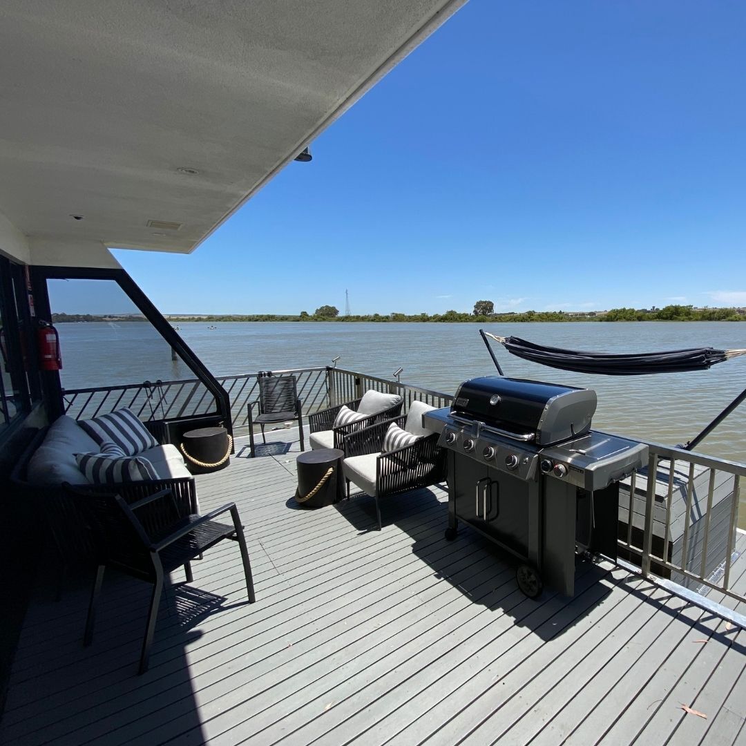 A bar table and stools on the undercover deck provide an ideal spot to enjoy a meal cooked on the BBQ, while the egg chairs and lounges are a favourite place to take in the views and activity on the River and enjoy a drink.