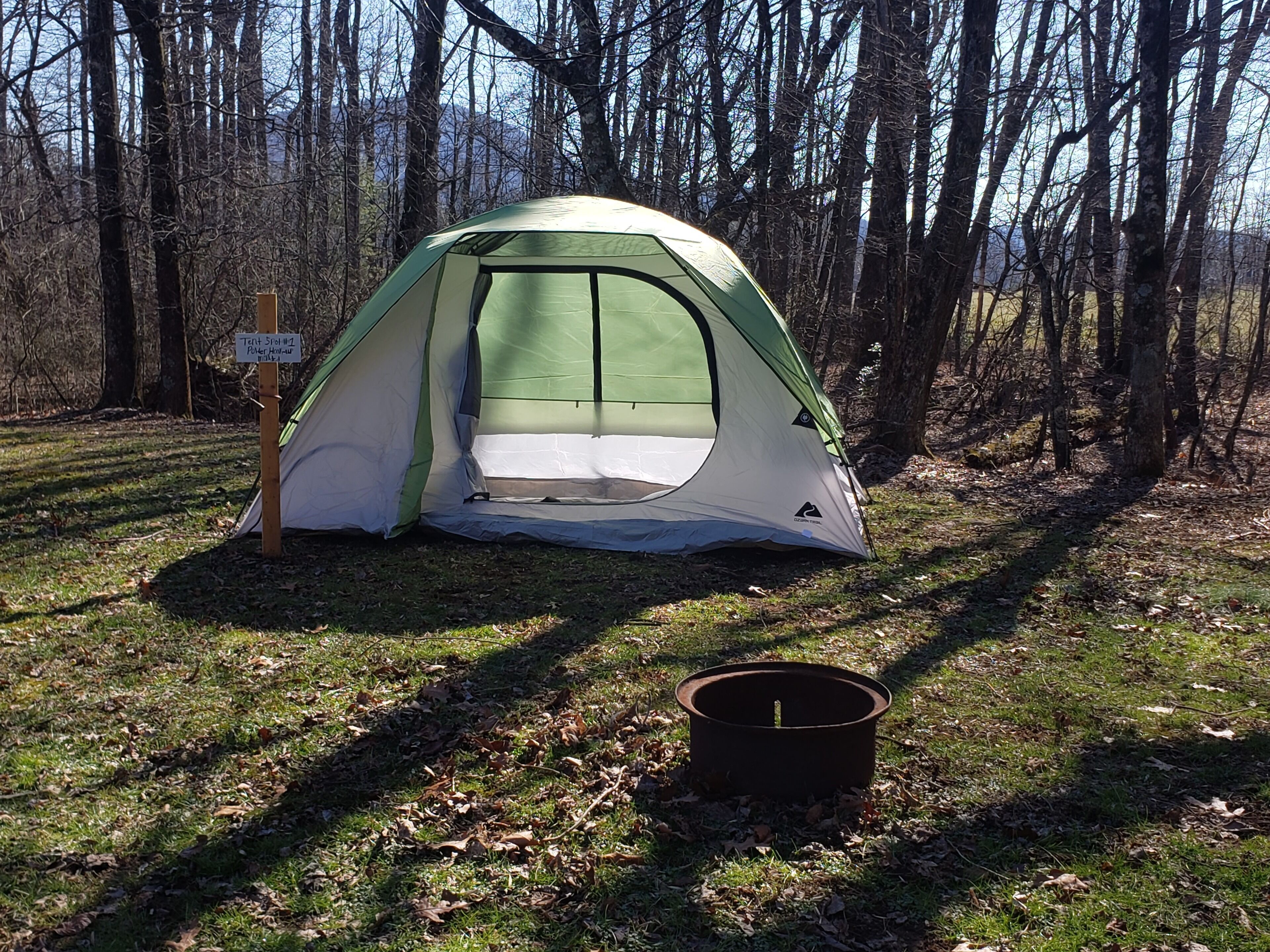 We have assigned spaces with electrical access for tents. This is for Tent Spot #2. The spaces are marked with numbers, 1 through 5 with electrical extension cord at each marked spot. The assigned spots are behind the yurts.