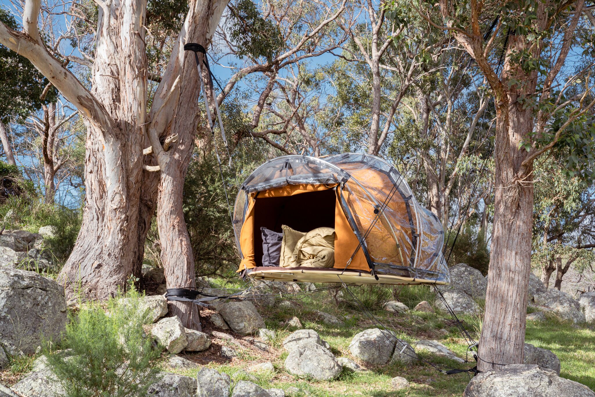 Captain Thunderbolt is our designer-appointed, luxe Bubbletent. Bubbletent guests will enjoy a queen-sized bed, premium natural linens, internal composting eco-toilet, and complimentary organic toiletries. The Mary Ann Bugg Tiny Bubbletent is part of this campsite and is suspended in the gum trees next to the deck. It comes with GlamSwag feather mattresses and bedheads, sleeping bags rated to -5C and has an internal privacy cover and insect screen for your comfort. It's rated to 200kgs so children and adults can share the Tiny Bubble Tent in a tree experience! Our Tiny Bubble Tent comes with its own designer GlamSwag bedding for our younger guests.
