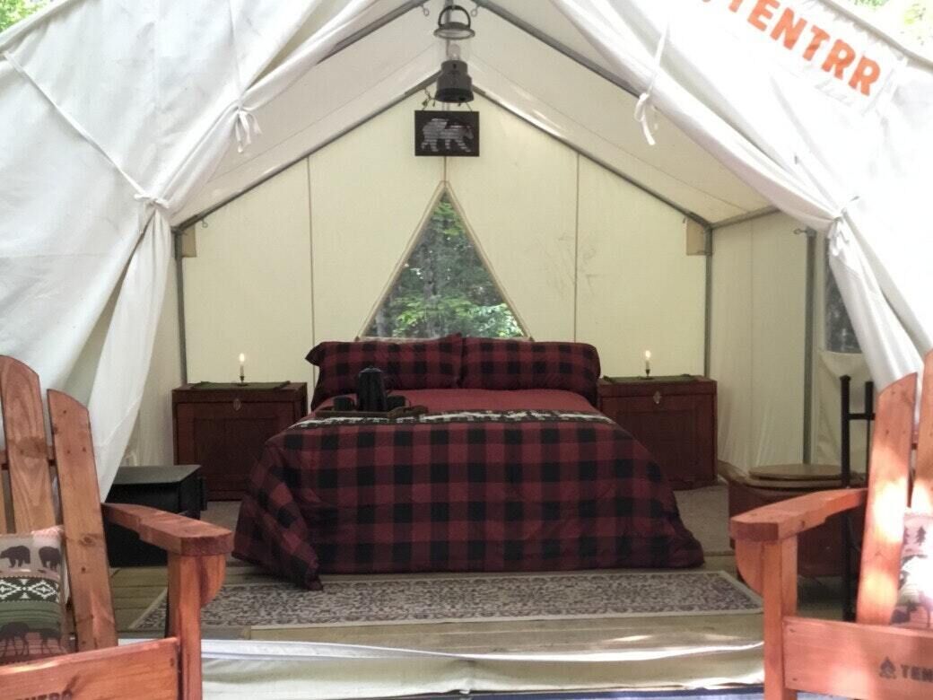 Get ready to relax in this superb 1-bedroom off-grid glamping tent in Saint Johnsbury. Comfortably sleeps 2 guests with a king bed includes all linens, your own charcoal grill, firepit and beautiful views. A superb feature is you are able to park at your site and walk to the Basecamp lodge which serves as guests common area includes two bathrooms, full kitchen access, TV, WIFI, Desk Workspace, refrigerator to store your food. We also include a gift shop where we sell custom T-shirts, Custom made cutting boards, fresh maple syrup, Ice, Firewood, Firestarter. The common lounge is located adjacent to Sugar Brook tent allowing your full privacy with the convenience of close proximity for restrooms etc. This is a must for anyone looking to experience hiking our many trails and really immersing in all glamping has to offer so come unwind in this marvelous retreat and experience the magic of Saint Johnsbury. Our guide book will share many interesting locations to visit during your stay.