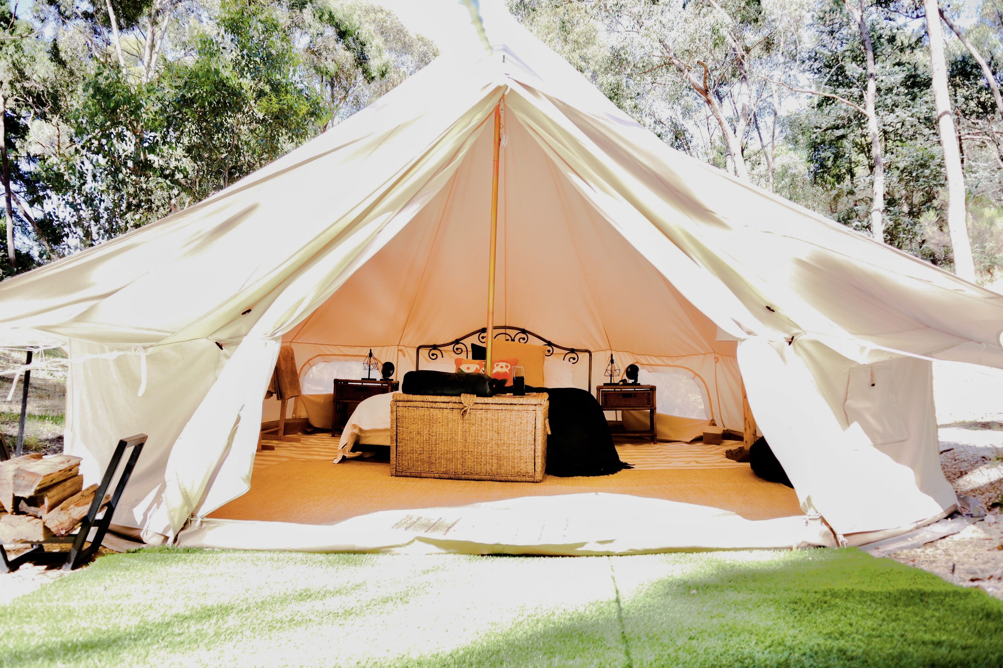 Beautiful nature landscape, sunrise views from every queen bed. Full amenities including the best campsite showers in Aus! Privacy guaranteed between tents and group. Next level Communal kitchen and dining area with camp fire! Wake up to birdsong, share memories together and indulge in food hampers and local world famous heathcote Shiraz!