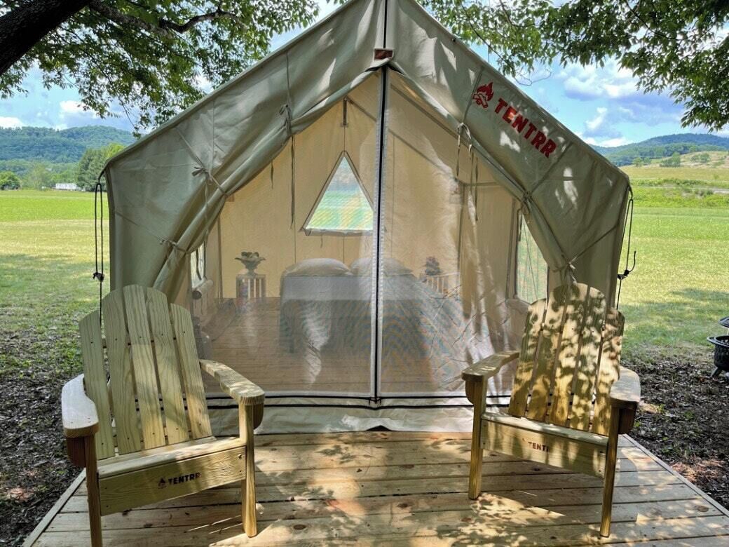 Almost heaven on the banks of the Greenbrier River. Our campsites are on the historic Hinton-Alderson Airport and overlook the scenic Greenbrier River. Only an hour and 15 minutes drive away from New River Gorge National Park. Look under Extras to see local amenities such as Kayaking, tubing, and canoeing. We have 3 sites at the airport, Cub, Stearman, and Skyhawk. There are over 100 yards between the sites, so your privacy is guaranteed! Firewood is on-site for the firepit/grill. The front of the tent faces the river, and the porch provides a scenic spot to watch the river flow! The Greenbrier River is a great place to fish for smallmouth bass. You can obtain a fishing license online by going to https://www.wvhunt.com. The airport does not have fuel, but KLWB has fuel, rental cars, a 7000-foot runway, and is only 18 nautical miles away! Also close to the KLWB airport is a fabulous WV Distillery (Smooth Ambler). If you fly into camp, you can get a rental car at KLWB and easily get to white water rafting and other outdoor adventures at New River Gorge National Park, and if you want to stay local there are several rafting companies that will provide you with a variety of watercraft, pick you up at the airport, and drop you off at a put-in location. They will meet you at the end of your float and return you to the airport! See the Extra tab for their names and numbers!