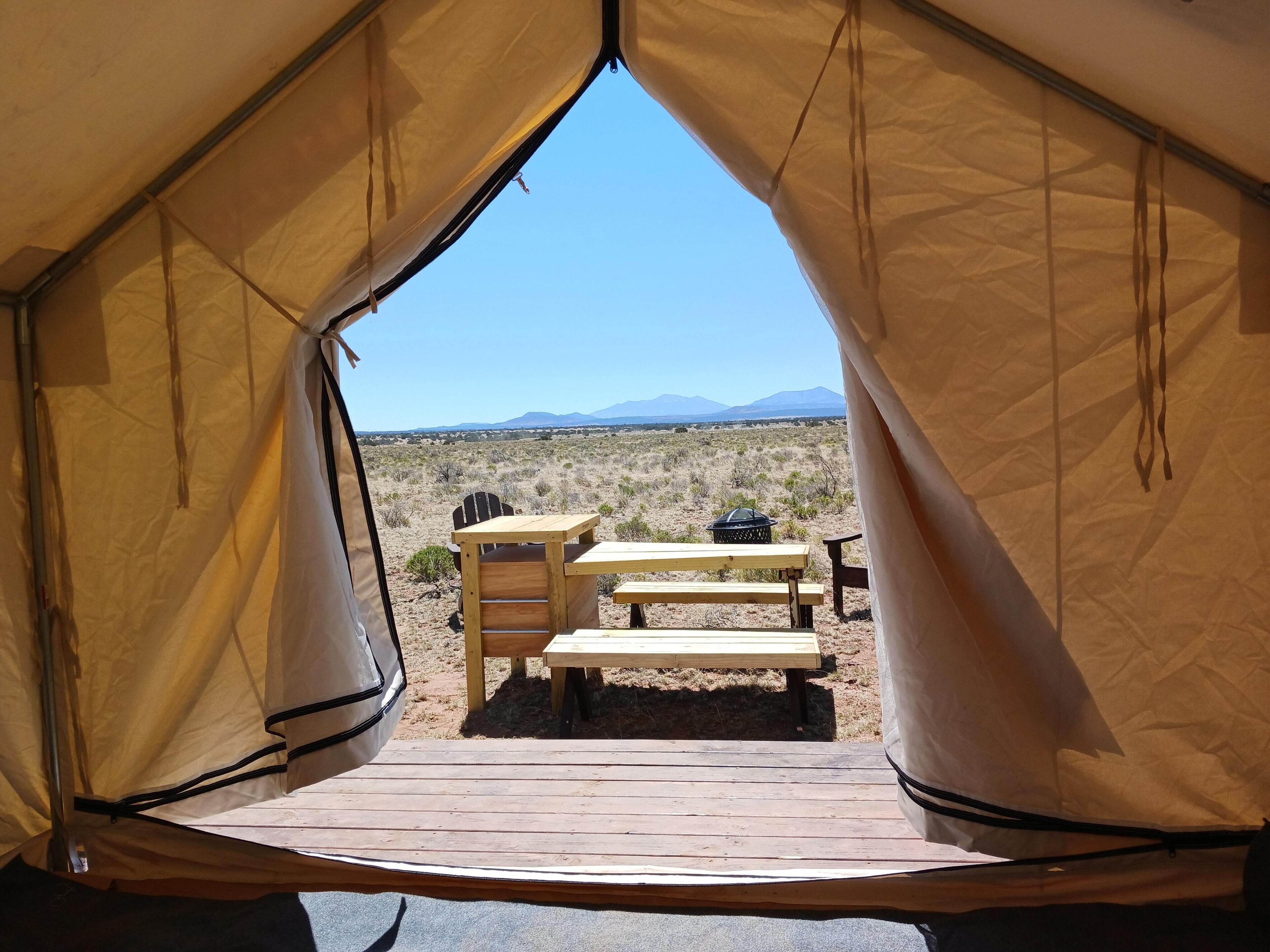 - "This awesome glamping tent setup made for a magic night on the Arizona plains. We got in super late but Jordon had helpfully sent through all the required information and the tent was perfect. We had a cold night (below freezing) but the quilt and heater kept the tent warm and cosy. Brilliant location for stargazing and check out the birds of prey show in the nearby campsite." - "Such a friendly reception and fantastic concept. Could see the night sky so perfectly. The bed set up was comfortable and it was great having chairs by the bon fire. It had everything we needed to enjoy our glamping experience!"