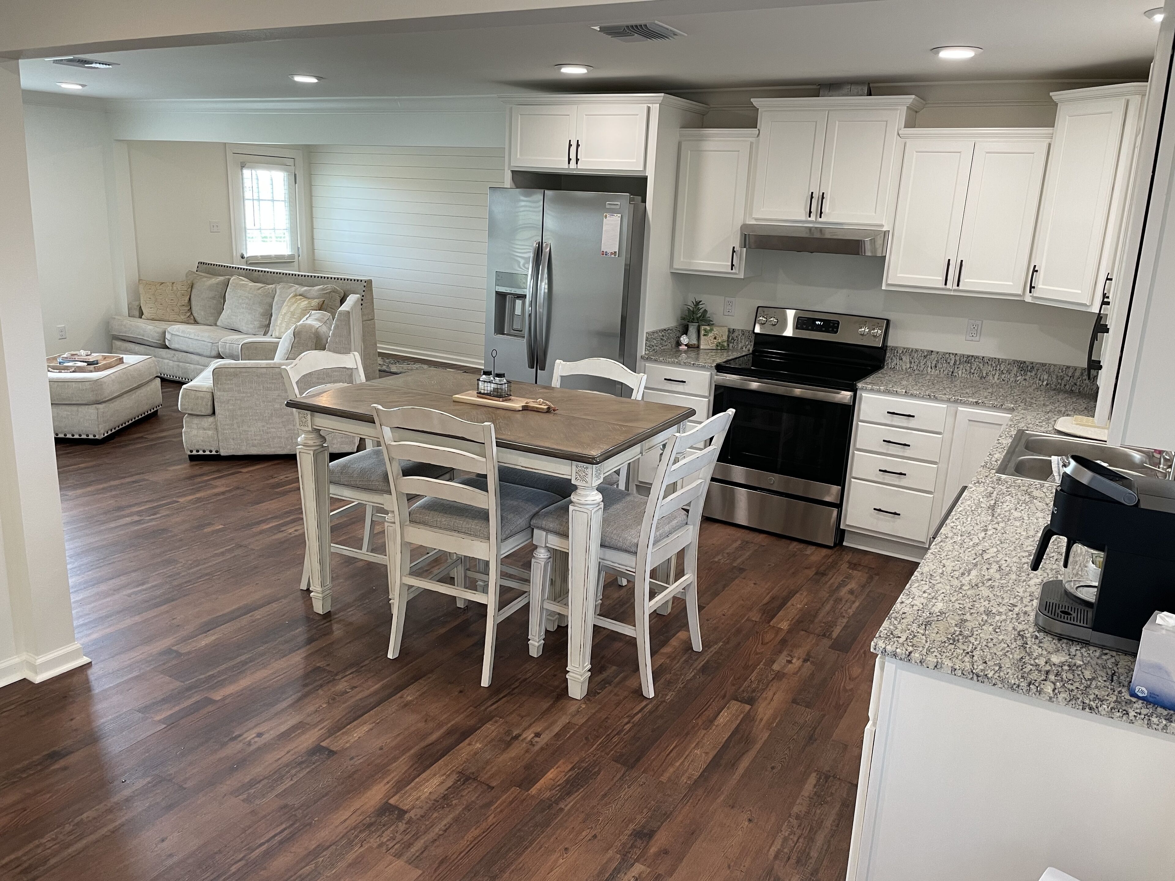 Step into our spacious 3-bedroom home and be greeted by a grand open kitchen adorned with bar seating and brand-new appliances. Adjacent is a convenient laundry room housing a washer and dryer. The dining room boasts a full-size table, perfect for memorable meals. Unwind in the expansive and cozy living area, complete with a streaming-capable TV. Accommodate your guests in a comfortable queen bed in one guest room, while another offers two twin beds and an additional TV. The guest bathroom features a full-size tub/shower. Retreat to the primary bedroom, boasting an attached bathroom for added privacy. Outside, indulge in the large backyard with stunning country views, outdoor seating, and a charming fire pit.