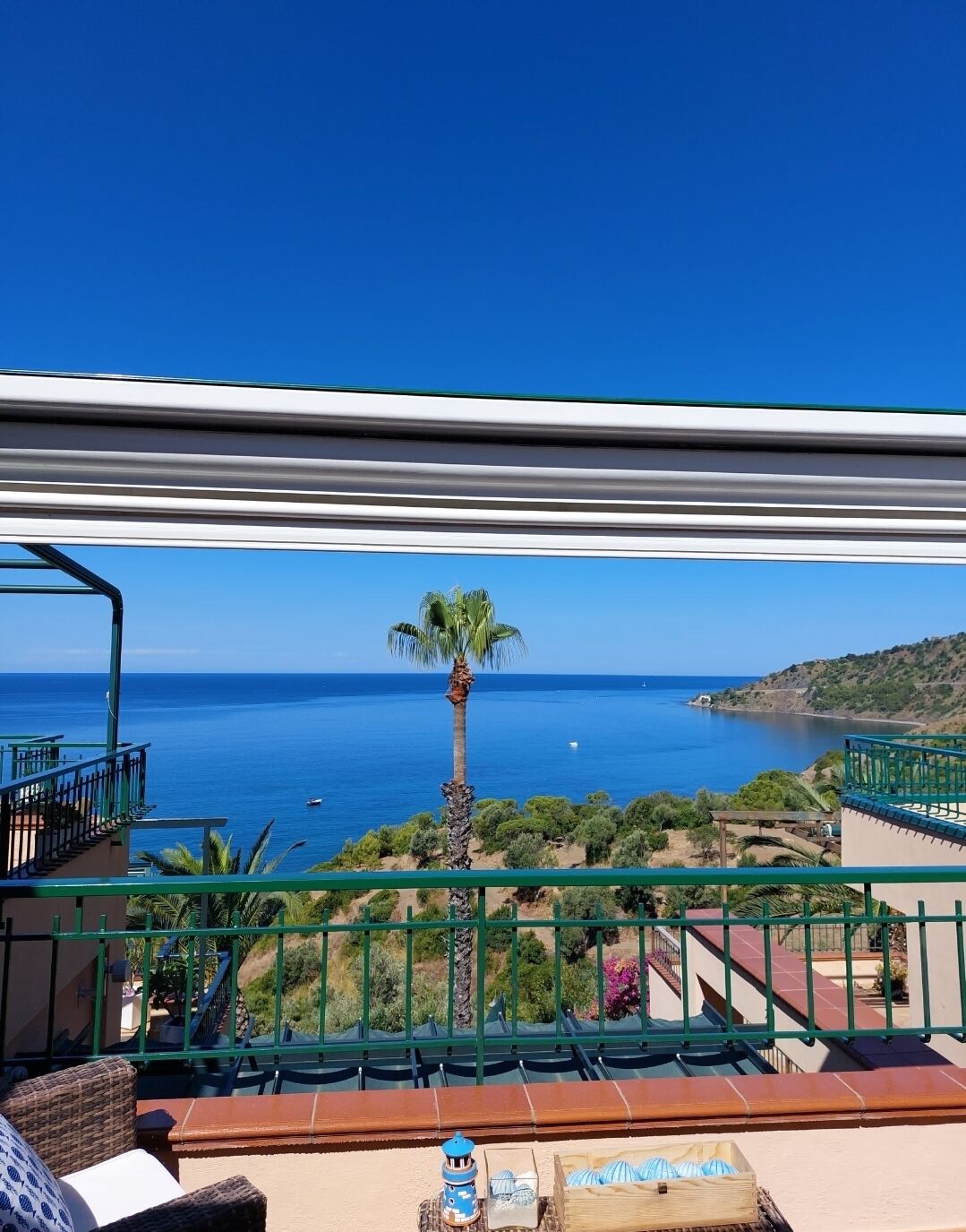 The terrace is 10 square meters (107 square feet) large. It is partly shaded by a porch. It is equipped with a table and chairs. From the terrace you will enjoy a gorgeous view of the sea.