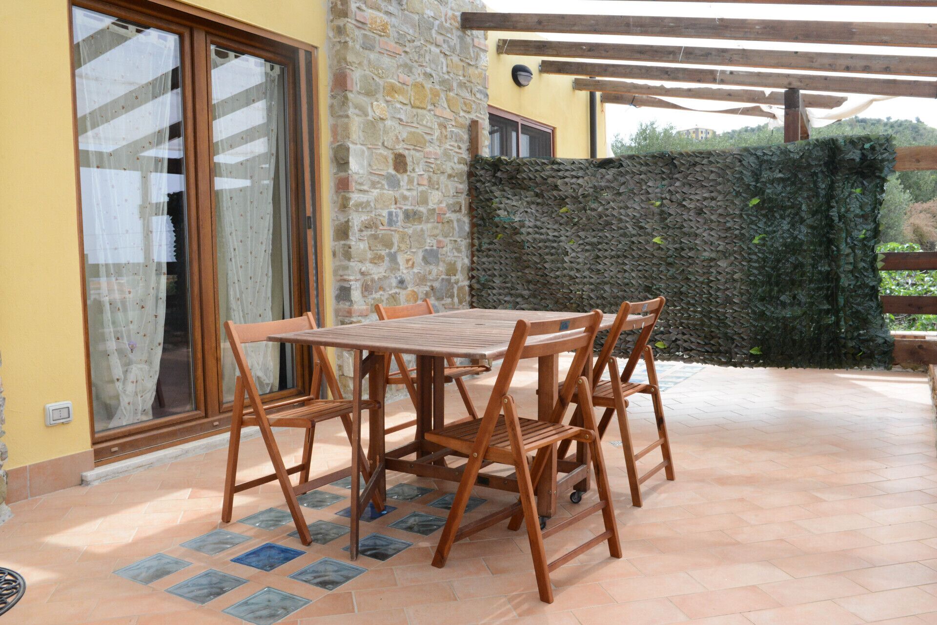 The patio is 15 square meters (160 square feet) large. It is partly shaded by a pergola. It is equipped with a table and chairs. From the patio you will enjoy a gorgeous view of the sea.