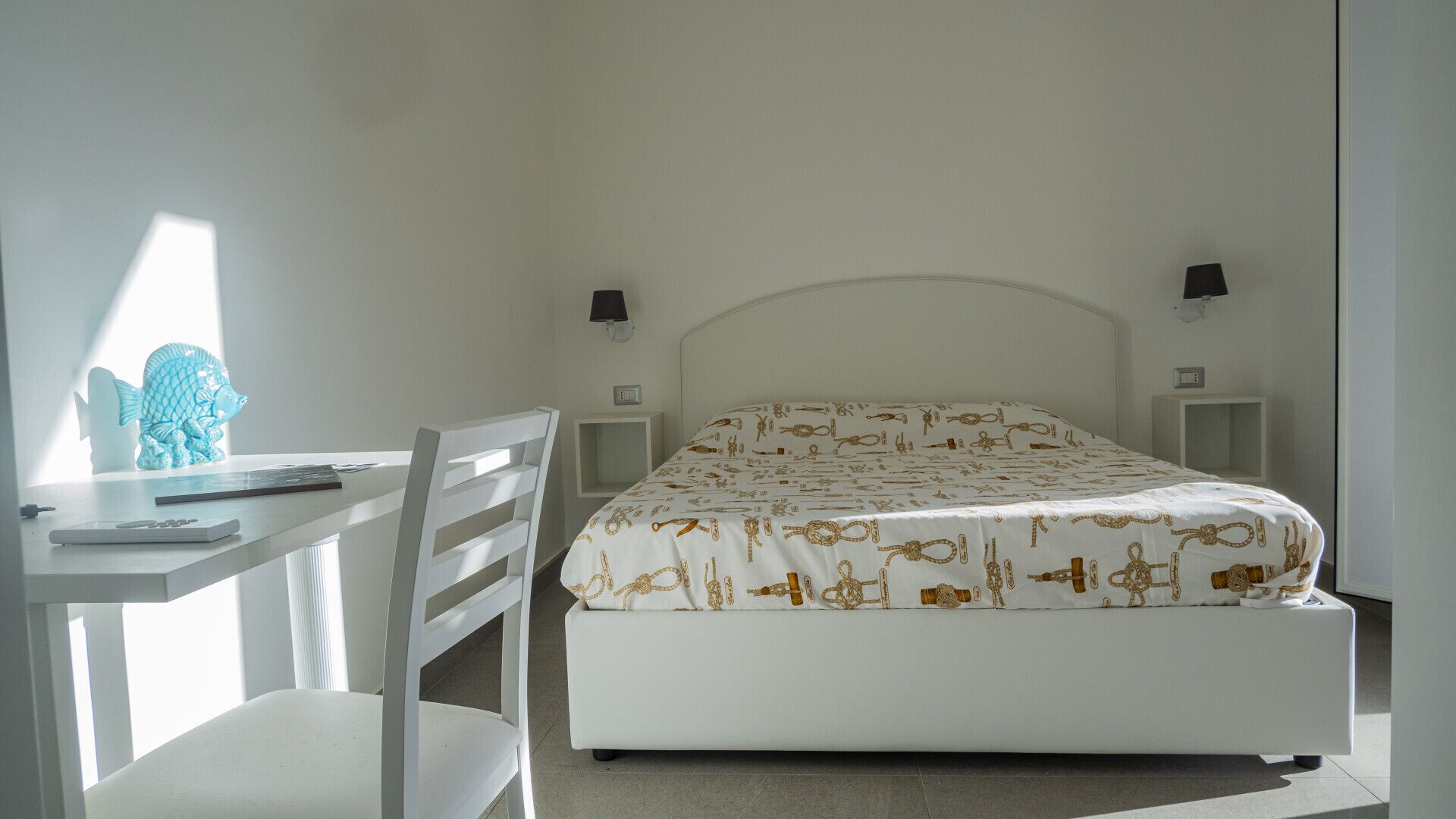 The bedroom has a matrimonial bed (160 cm/63 inches, wider than a queen-size bed). The room has a Juliet balcony with a view of the sea. The bedroom is equipped with an air conditioning/heating unit.