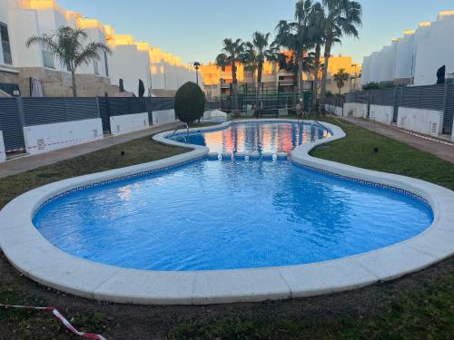 Terraced house with three swimming pools and green area with natural lawn and trees in a highly accredited urbanization in Alcocebre, has three double bedrooms two of them with wardrobe also has solarium, and sofa bed (8 seats) independent kitchen with all appliances dishwasher , Washing machine, fridge and microwave. Large lounge with access to large terrace in front of the pool