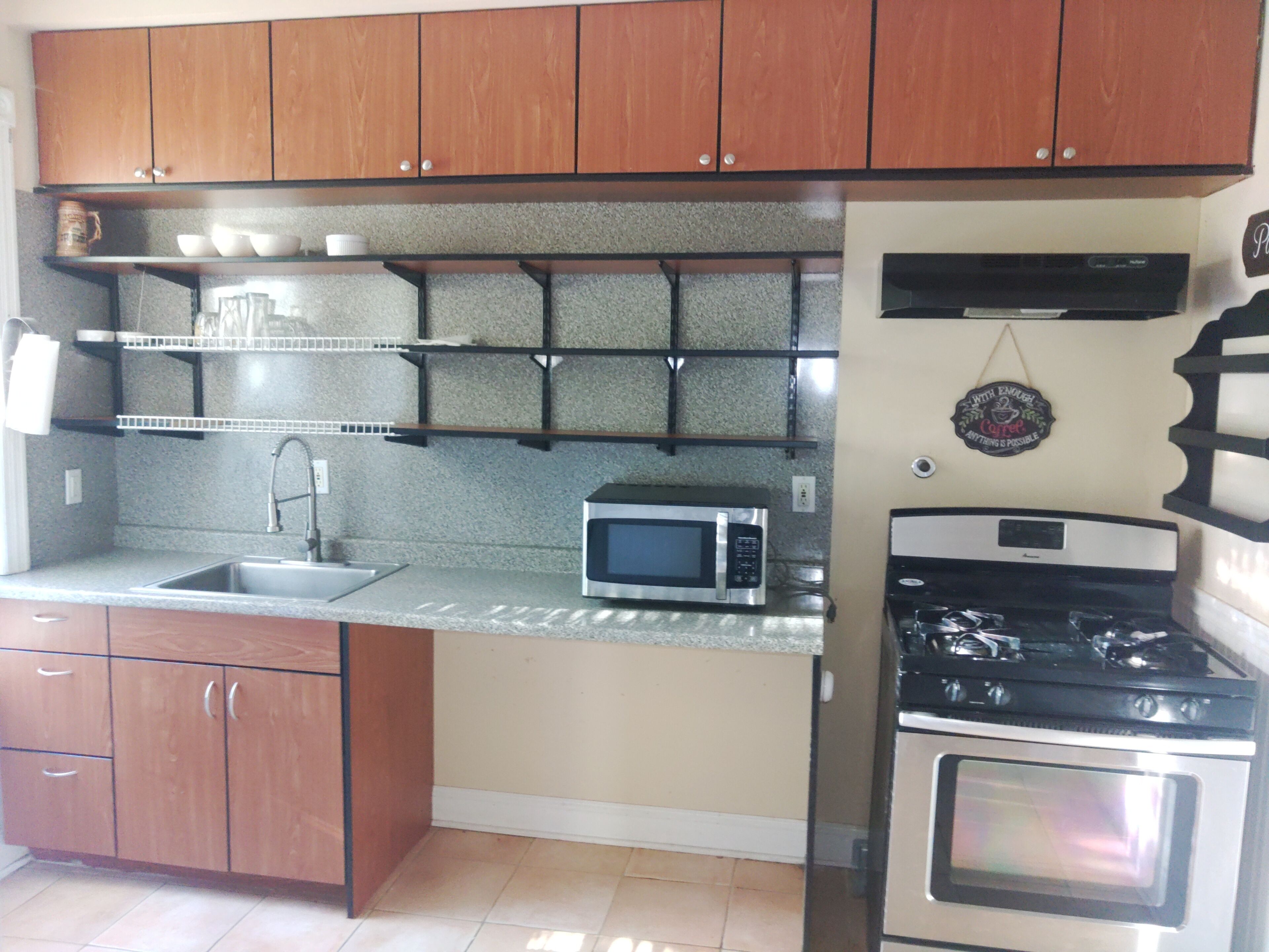 Enjoy a fully equipped kitchen featuring an oven, stove, microwave, coffee maker, toaster, mini fridge, and hot water kettle. Essentials like pots, pans, oil, salt, and pepper are provided. Dine indoors or savor meals on the furnished patio.