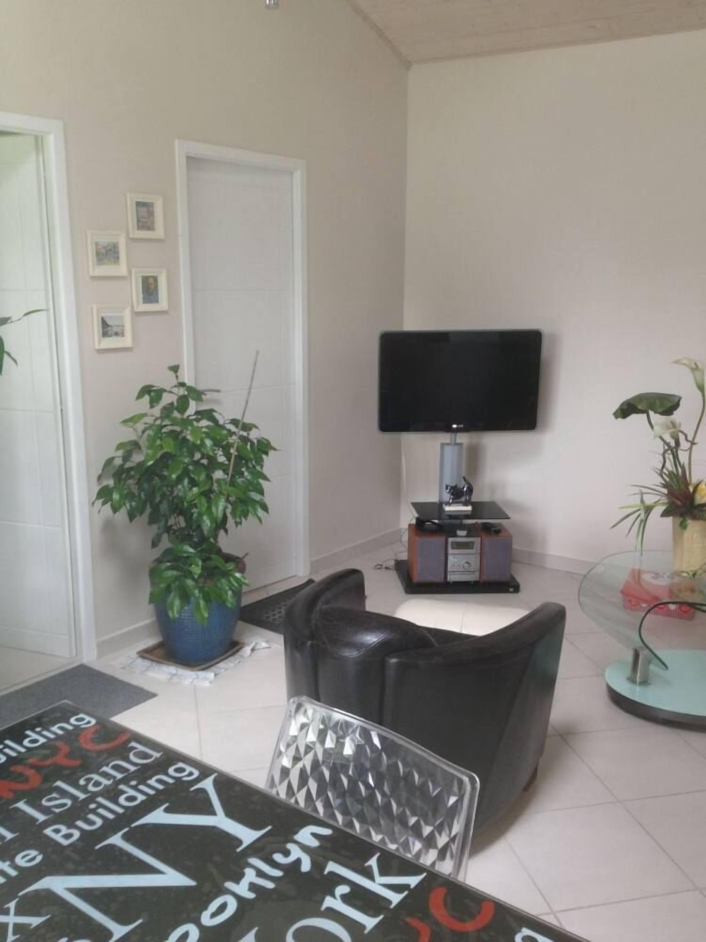 The bright and welcoming living area features a comfortable sofa, a dining table for sharing good meals, and a flat-screen TV for cozy evenings. The space is subtly decorated to create a warm and inviting ambiance, perfect for unwinding after a day of exploring the area.